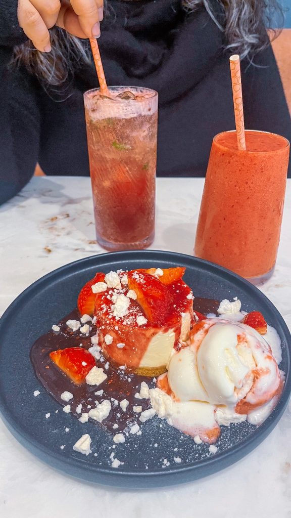 La pluie s’est calmée pendant notre visite. Nous remontons vers Blake Street pour aller goûter chez Heavenly Desserts qui, paraît-il, mérite bien son nom. Le choix est difficile dans la carte immense, mais nous décidons sagement de partager un cheesecake fraises à la crème, que j’accompagne d’un mojito grenade et Chouchou d’un smoothie baies rouges-yuzu.