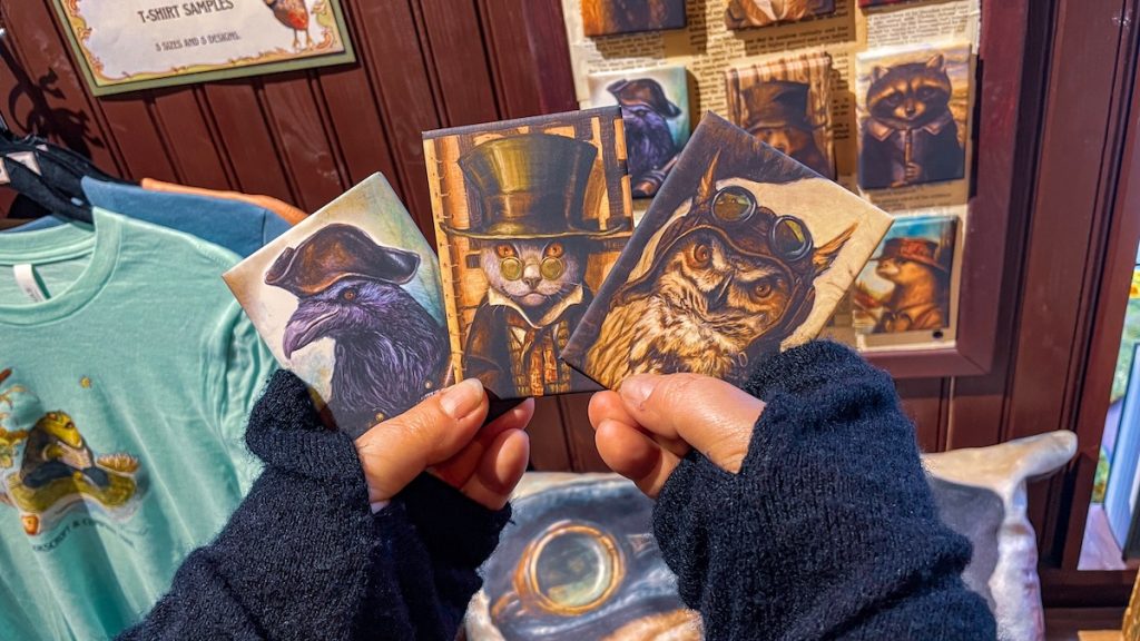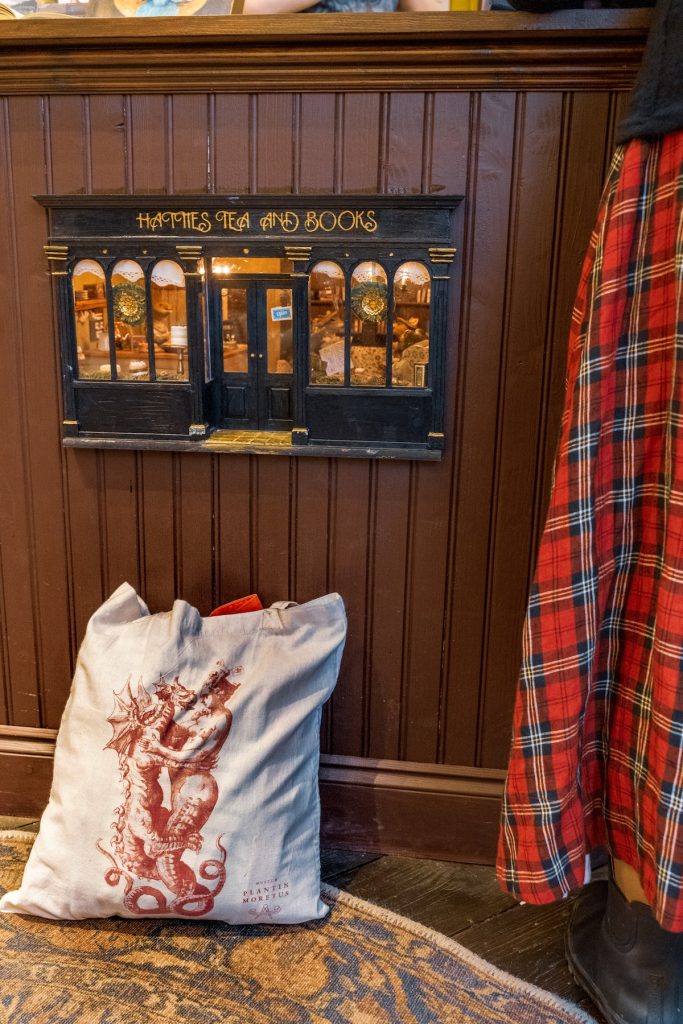 L’intérieur de la boutique est tout aussi magique que l’extérieur le laissait présager, plein de mille trésors partout où le regard se pose. Je m’offre les deux romans ainsi que quelques brols, et hésite mais renonce à emporter un tableau magnifique représentant un hibou avec un casque de pilote d’avion: j’aurais trop peur de l’abîmer pendant le transport.
