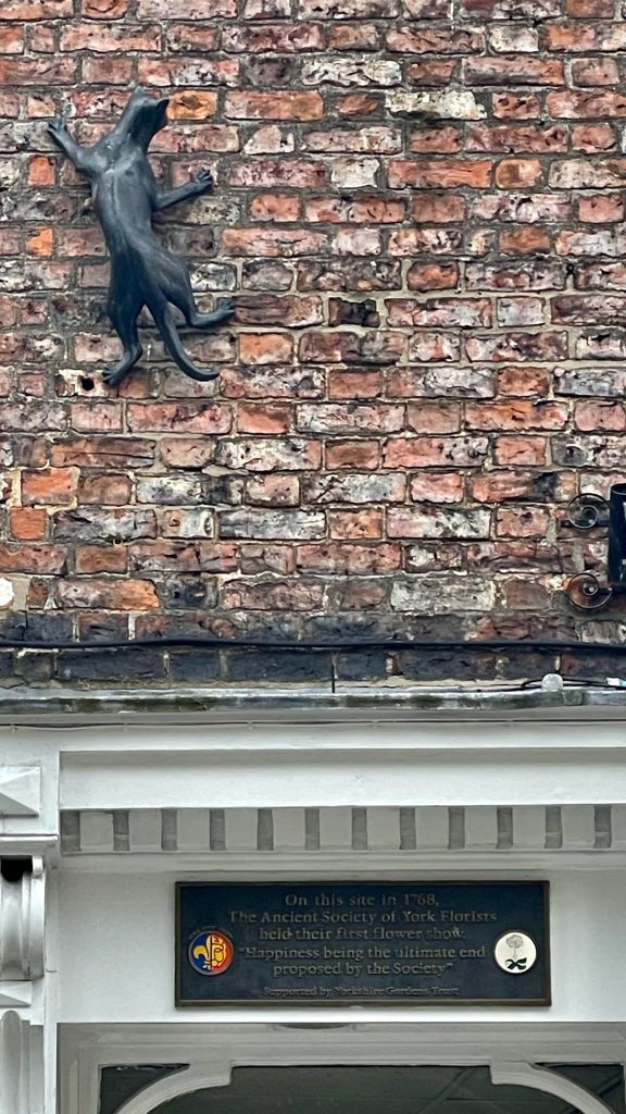 Nous commençons par chercher deux caches virtuelles autour des Shambles, ce qui nous permet d’apprendre pour quelle raison on voit des chats en fer forgé un peu partout sur les façades. A l’époque où sévissait la peste, ils ont été installés là dans l’espoir de faire fuir rats et souris. Pas sûre que ça ait fonctionné, mais c’est assez amusant de les chercher. Il existe même un York Cat Trail, jeu de piste gratuit dans le centre historique qui vise à en localiser 22 lors d’une balade de deux heures.