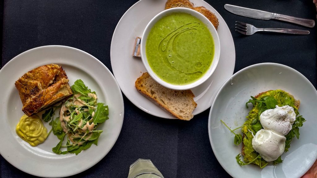 Nous faisons appel à un Uber pour nous conduire jusqu’à l’Alhambra Hotel où nous déposons le Monstre Billabong et mon fameux sac à dos jaune. Puis nous prenons le métro jusqu’à Picadilly Circus. La place, désormais fermée sur un côté, est devenue très moche depuis mes premiers séjour à Londres, mais peu importe. Nous faisons d’abord un tour au très grand Waterstones voisin. Nous y brunchons au restaurant du dernier étage, près d’une baie vitrée par laquelle nous apercevons le London Eye dans le lointain. Tartine d’avocat, sausage roll et soupe petit pois-menthe, servis par un monsieur adorable qui nous parle dans un français pas mauvais.