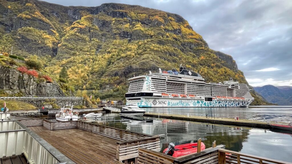 Mauvaise surprise ce matin au réveil: un monstrueux navire de croisière est arrêté dans le port de Flam, où il oblitère toute la vue. #savethesea, clame une inscription sur son flanc. En pourrissant les fjords à la place? J’ai du mal à exprimer la révulsion absolue que m’inspirent ces immeubles flottants. Moi qui avais décidé de passer deux nuits ici pour profiter du calme et de la sérénité de l’endroit… Vraiment, c’est bien raté.