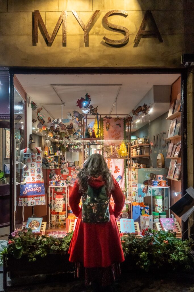 Lorsque nous ressortons après nous être brièvement installés, la nuit est déjà tombée. Nous mettons le camp sur Old Town et Cockburn Street, où se trouvent deux de mes boutiques préférées: Eden et Mysa. Je n’ai pris qu’une option « bagages à main » pour ce voyage, donc pas question de faire de shopping volumineux, mais je craque quand même pour deux très jolis petits livres: une édition avec couverture en tissu d’un classique de la littérature enfantine, « The worst witch », et un ouvrage intitulé « A parliamant of owls », consacré à ces noms de groupes animaux que j’aime tant.