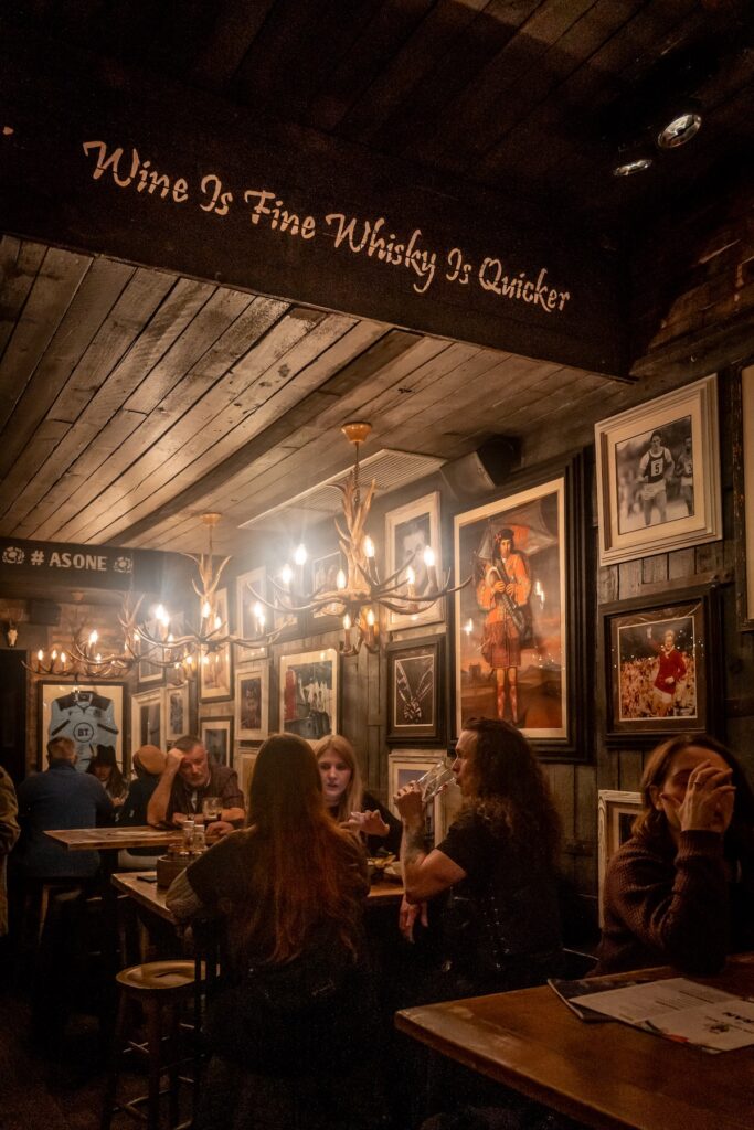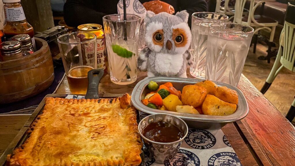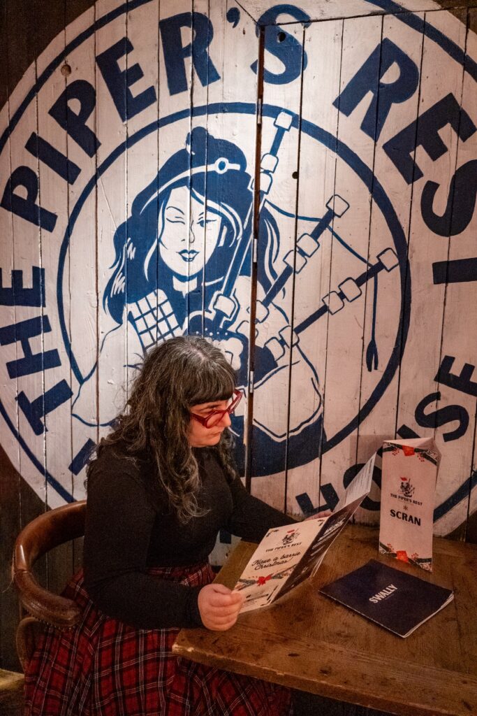 Nous poursuivons jusqu’au parvis du château illuminé de violet, de rouge, de bleu et de vert pour prendre quelques photos qui ne donneront pas grand-chose. Puis nous descendons jusqu’au pub The Piper’s Rest, où nous avions déjà mangé lors de notre voyage précédent (et où j’avais réservé car c’est généralement pris d’assaut le soir). Le lieu est toujours aussi sympa: quand nous arrivons, ils passent les Red Hot Chili Pipers, qu’ils finissent par couper pour laisser la place à The Gorms, deux barbus qui interprètent des chansons écossaises en live. C’est pas Vivaldi, mais à vrai dire j’aime encore plus! Chouchou prend un burger au haggis et moi la tourte de Noël. Comme la dernière fois, on se régale. 10% de service sont automatiquement ajoutés à notre addition, même si nous avons la possibilité de les refuser (je ne le fais pas). C’est nouveau, et nous nous apercevrons au cours des journées suivantes que c’est devenu une pratique courante dans la plupart des restaurants.