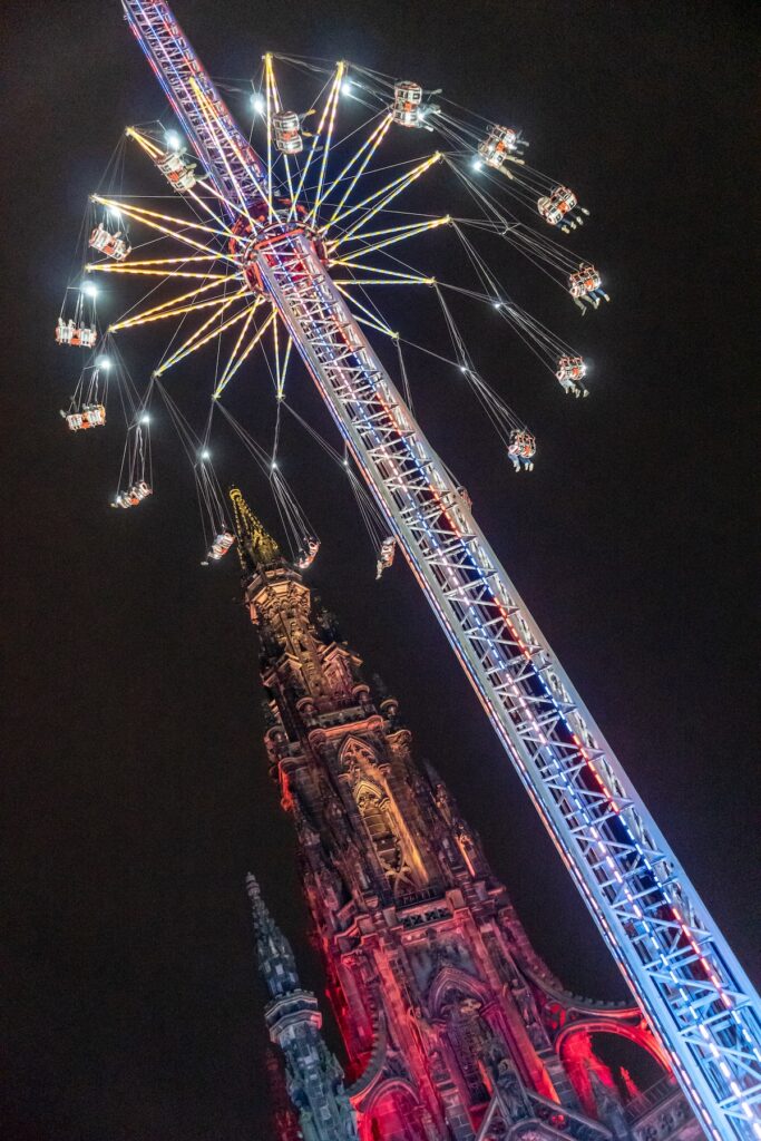 L’excellente surprise que nous avons eu en longeant Princes Street en tram tout à l’heure, c’est que le marché de Noël était déjà installé et qu’il ouvrait… aujourd’hui même à 18h. Mieux encore: cette année, les chaises volantes sont de retour! J’avais été très triste de les manquer en décembre 2022. Donc, le ventre plein, nous fonçons droit vers le Starflyer et son poteau de 80 mètres de hauteur qui tutoie le sommet du Scott Monument.