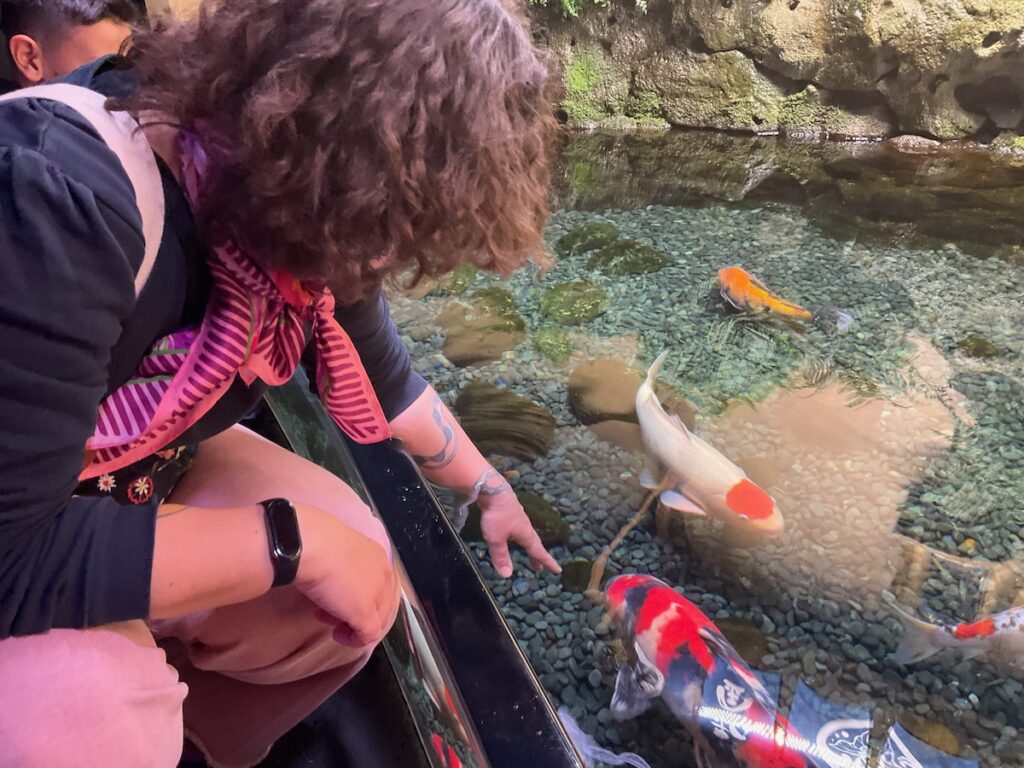 Après les méduses, il y a un bassin à caresses. Deux règles seulement: se laver les mains à l’eau et au savon avant de les mettre dans l’eau, et ne pas aller vers les carpes koi mais les laisser venir d’elles-mêmes. Moyennant quoi, une flopée de gamins plongent leurs mains pas lavées dans le bassin et gesticulent pour tenter d’attraper les poissons sous le regard ennuyé ou vaguement attendri de leurs parents. Je.