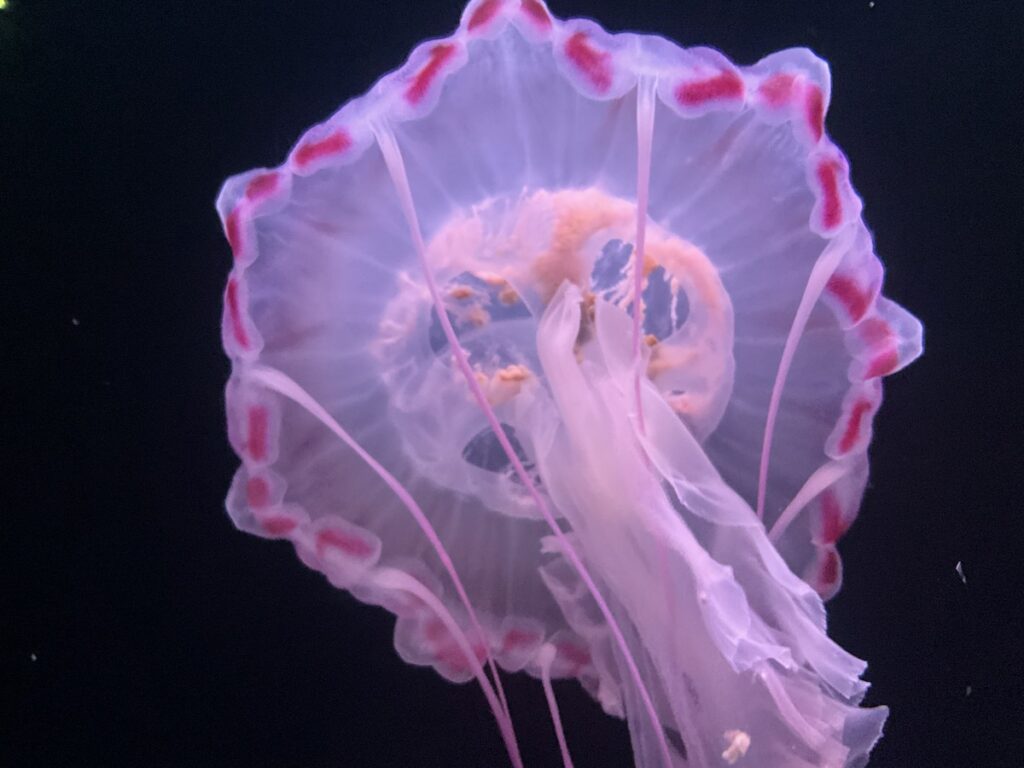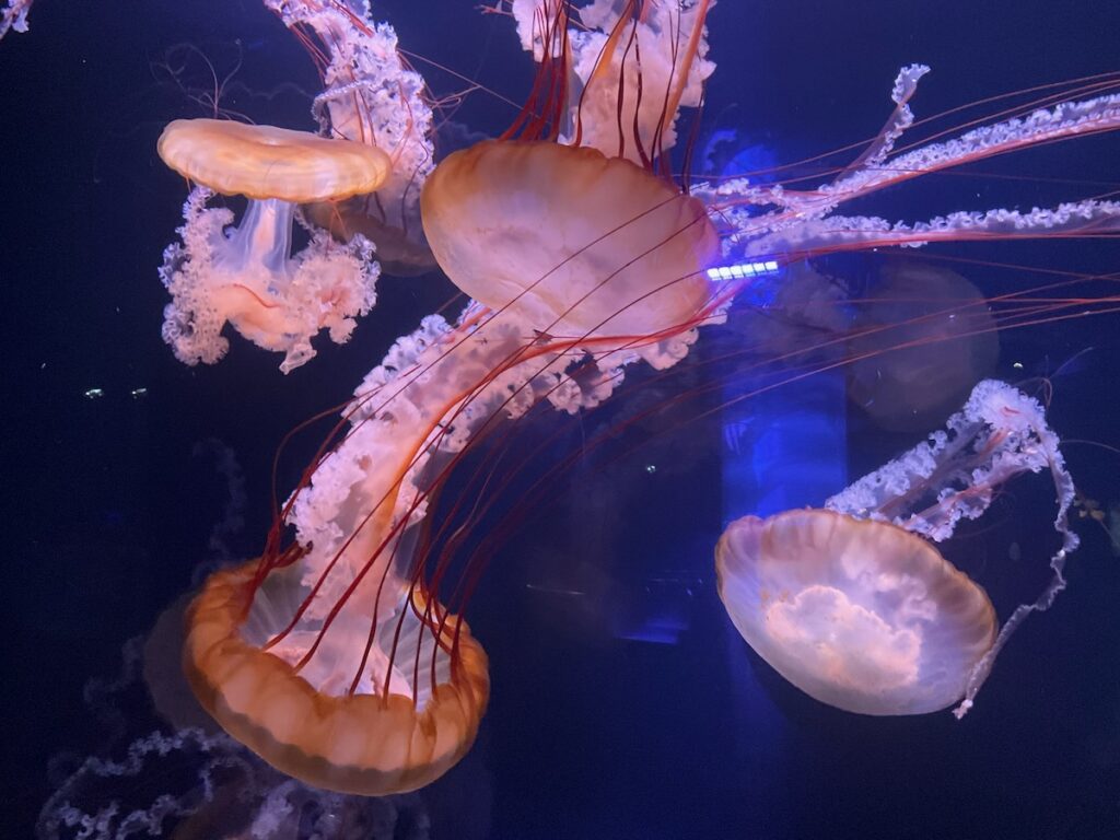 Enfin, nous pénétrons dans une rotonde bordée d’aquariums tous occupés par des méduses, et je deviens complètement gaga. Je pousse des exclamations ravies, je roucoule tel un pigeon voleur de scone, je leur dis qu’elles sont magnifiques, je m’extasie devant leur niveau de toxicité, je les mitraille avec mon iPad mini en m’étonnant d’obtenir un résultat aussi potable. Je suis émerveillée comme je ne le suis jamais devant des êtres humains (mais présentez-moi un ornithorynque et je ne répondrai plus de rien). Si j’étais seule, je pense que je pleurerais d’émotion. Parce que la nature est sublime et que nous la massacrons un peu plus chaque jour. Je ne suis jamais aussi près d’envisager l’existence de Dieu que lorsque je contemple des animaux.