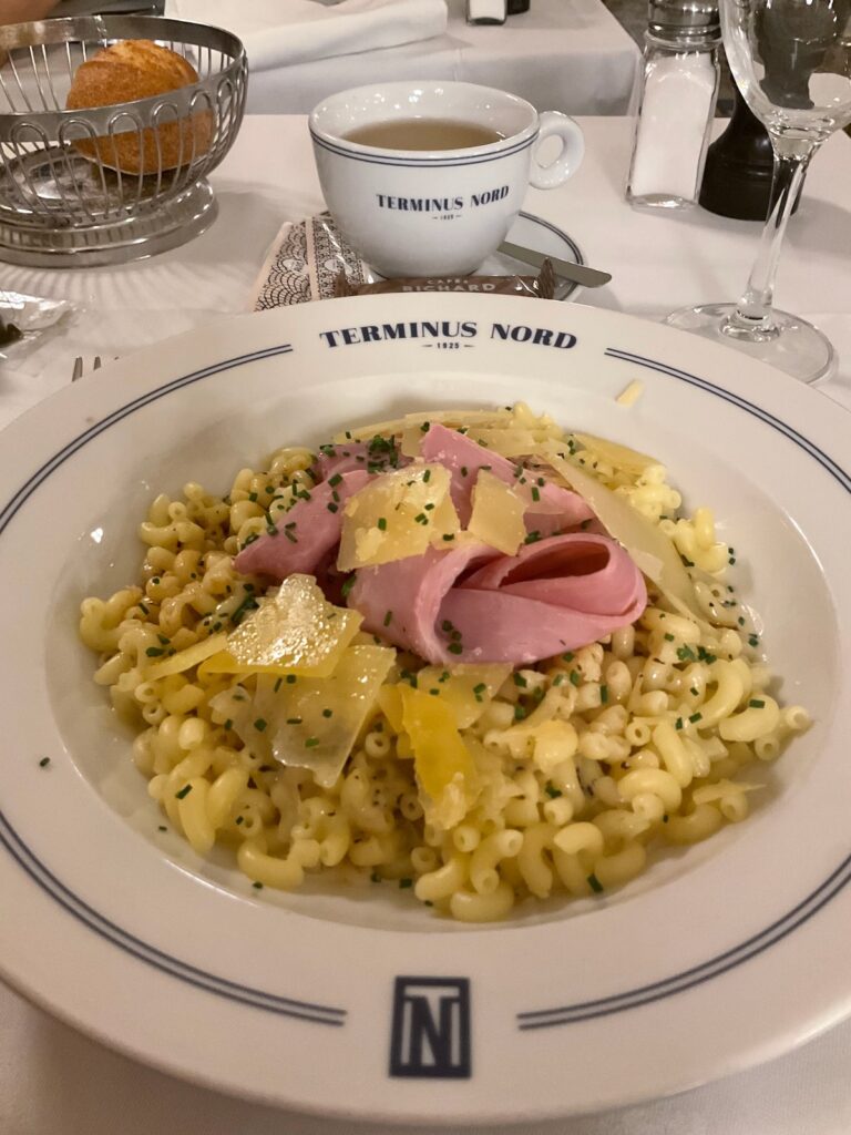 J’ai encore du temps avant de prendre mon train, aussi j’en profite pour dîner en attendant. Faute d’autre resto qui m’inspire dans les environs, j’atterris au Terminus Nord, brasserie mythique que j’avais toujours dédaignée par… snobisme inversé, je pense. C’est une excellente surprise: la salle est vaste, belle et pas trop bruyante à 18h. J’hésite entre un vol-au-vent et les coquillettes à la truffe avant de pencher pour ces dernières, avec un thé au jasmin pour ne pas m’endormir le nez dans mon assiette. A la table voisine, deux rôlistes commentent d’une voix très forte leur dernière partie de Nephilim; je suis partagée entre l’envie de me joindre à la conversation et celle de leur faire remarquer sèchement qu’ils ne sont pas seuls au monde.