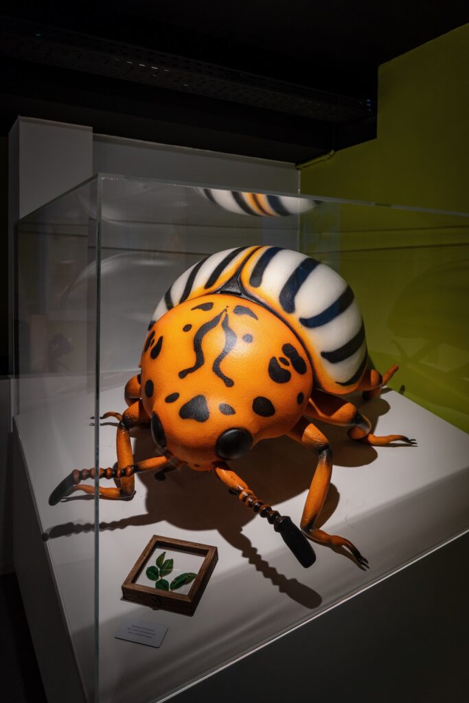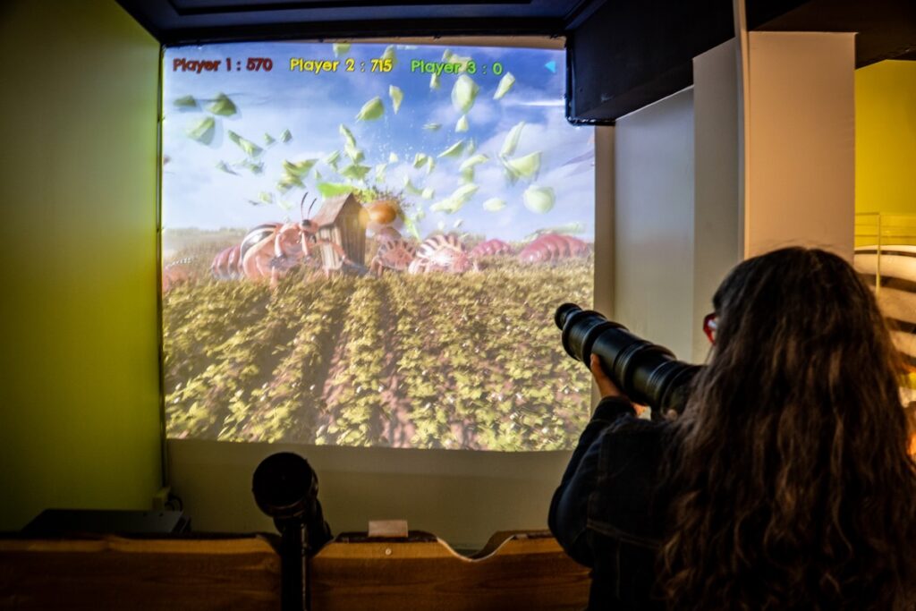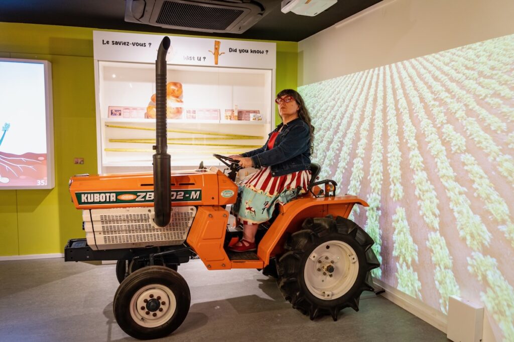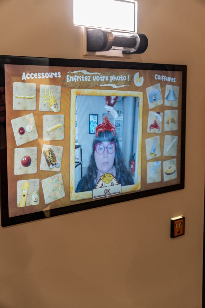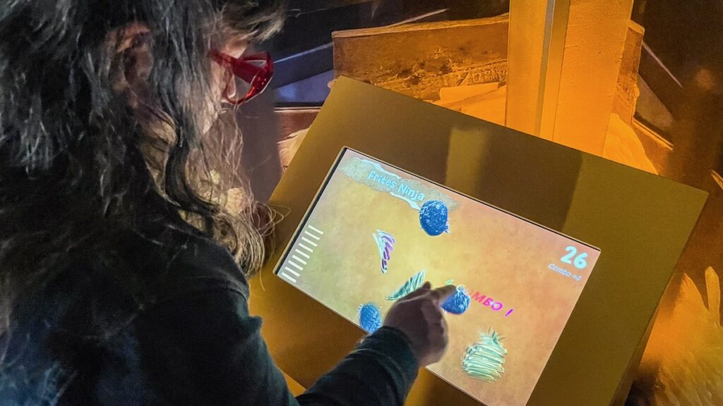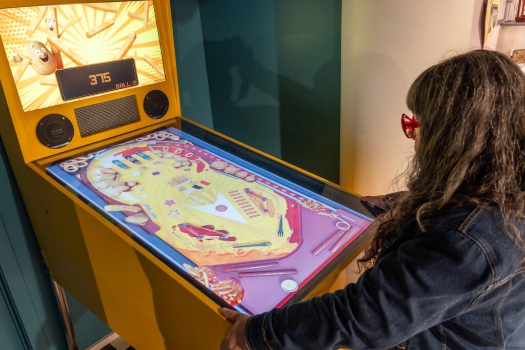 J’ai horreur des audioguides, que je dédaigne systématiquement. Là, j’ai quand même dû en prendre un, ne serait-ce que parce qu’il faut le scanner pour franchir le portillon d’entrée. Par la suite, même si on n’a pas envie d’écouter les explications et qu’on préfère lire les panneaux, on peut l’utiliser pour activer les multiples bornes de jeu qui émaillent le parcours. Nos préférées: le tir sur insectes nuisibles avec de gros flingues réjouissants, le flipper numérique et le Frite Ninja. Un gros effort de muséographie a été fait pour rendre la visite hyper ludique; si vous emmenez vos enfants, ils ne s’ennuieront pas!