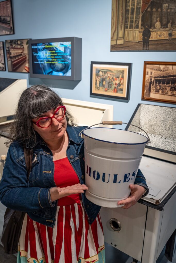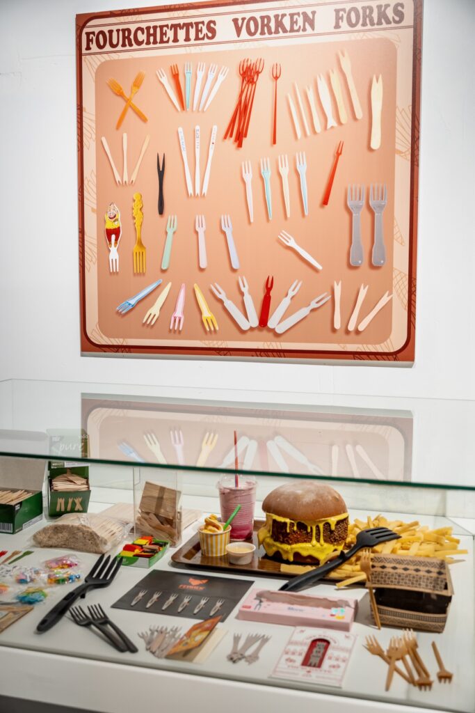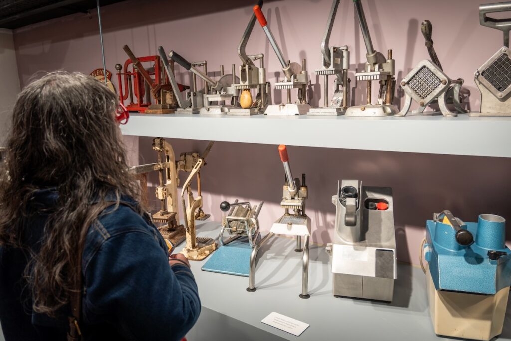 On admire par ailleurs un impressionnant éventail d’objets sur le thème, depuis les coupe-frites jusqu’aux affiches publicitaires, en passant par les friteuses familiales ou industrielles, les salières, les sauces et même les différentes sortes de fourchettes en plastique et de contenants utilisés par les friteries. Un improbable juke-box joue à la demande toutes les chansons de la variété francophone ou néerlandophone qui parlent de frites; un orchestre de pommes de terre se trémousse sur une estrade. Franchement, nous nous sommes beaucoup amusés.