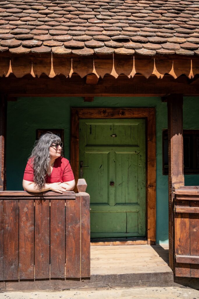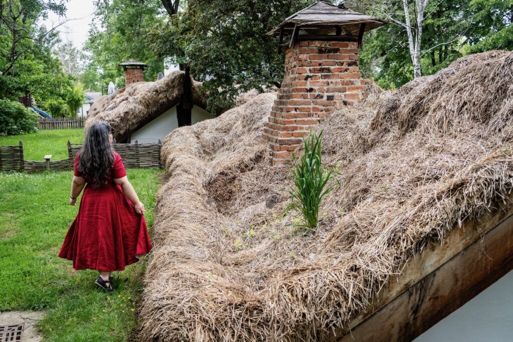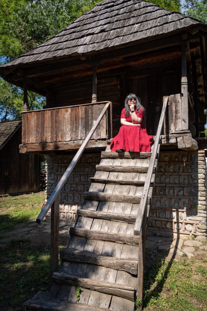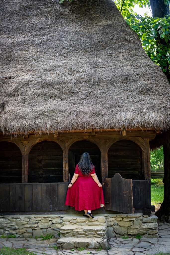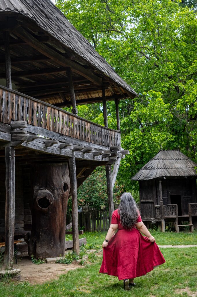 Devant un plan du parc, nous convenons avec Chouchou que l’endroit semble immense et que mon état de fatigue ne nous permettra pas de l’explorer entièrement. Nous décidons de nous concentrer sur les bâtisses représentées en jaune (celles qui sont originaires de la région de Transylvanie). Mais nous nous plaisons beaucoup dans ce lieu calme et reposant. Au final, nous devons en parcourir au moins les deux tiers. Je suis particulièrement séduite par les toitures aux silhouettes variées, tantôt élancées et couvertes de lamelles de bois en quinconce, tantôt trapues avec des tuiles en écailles de poisson, tantôt enfoncées dans le sol et faites de chaume. Ici comme dans le centre historique, nous apercevons pas mal de chats errants peu farouches, et même une vieille dame qui les nourrit près d’un banc.