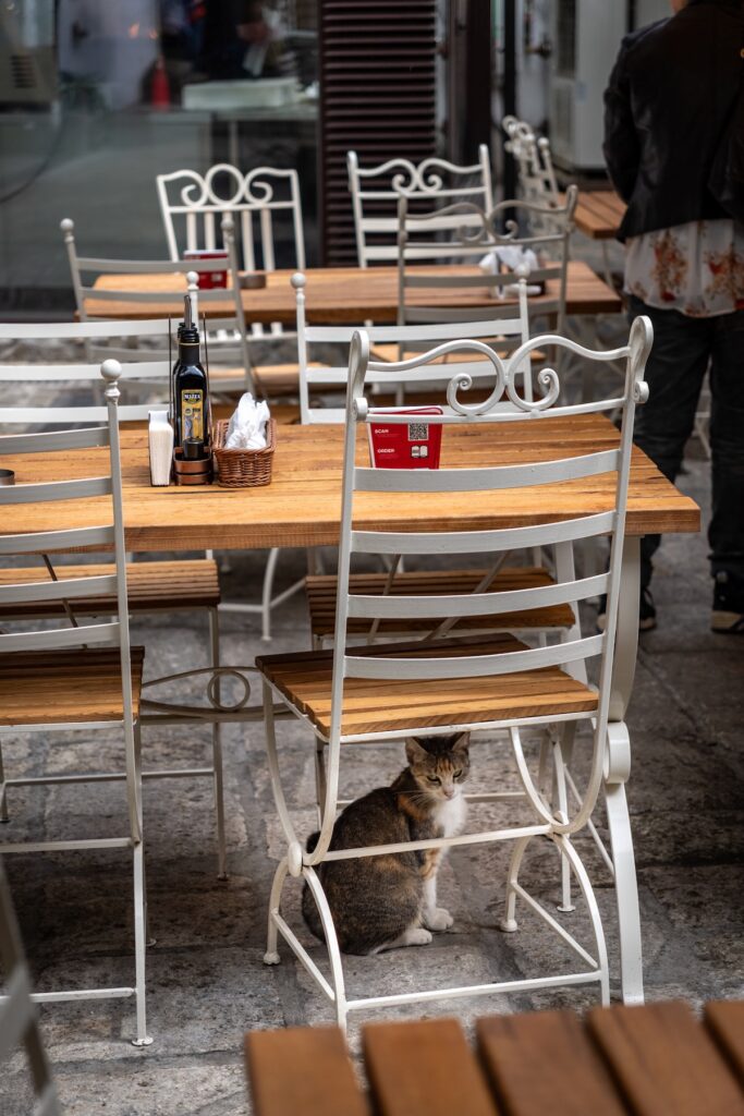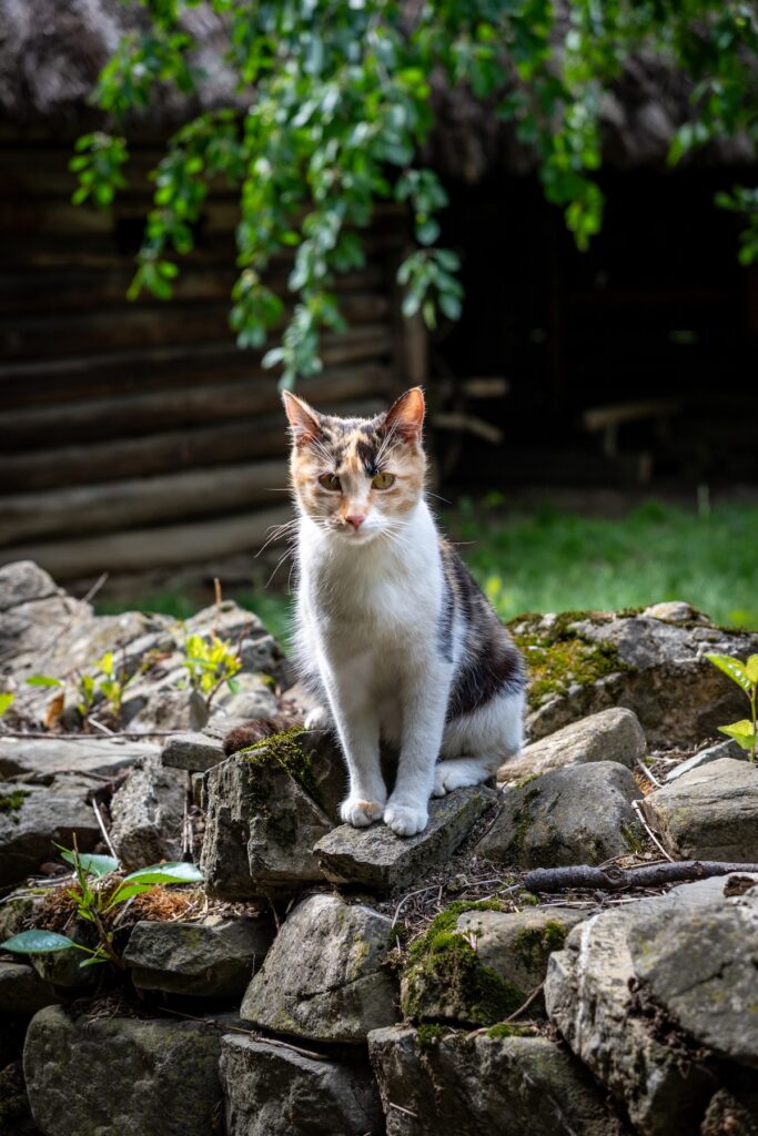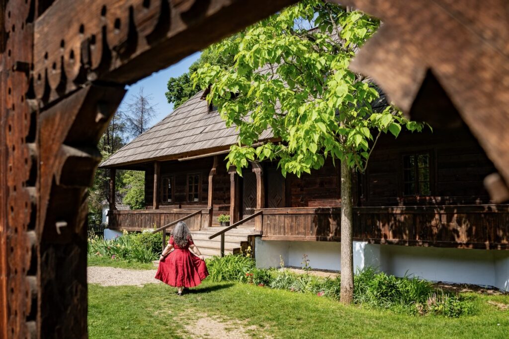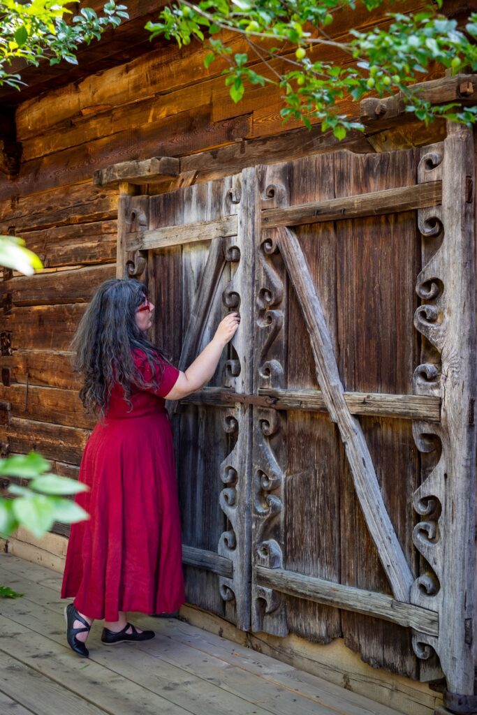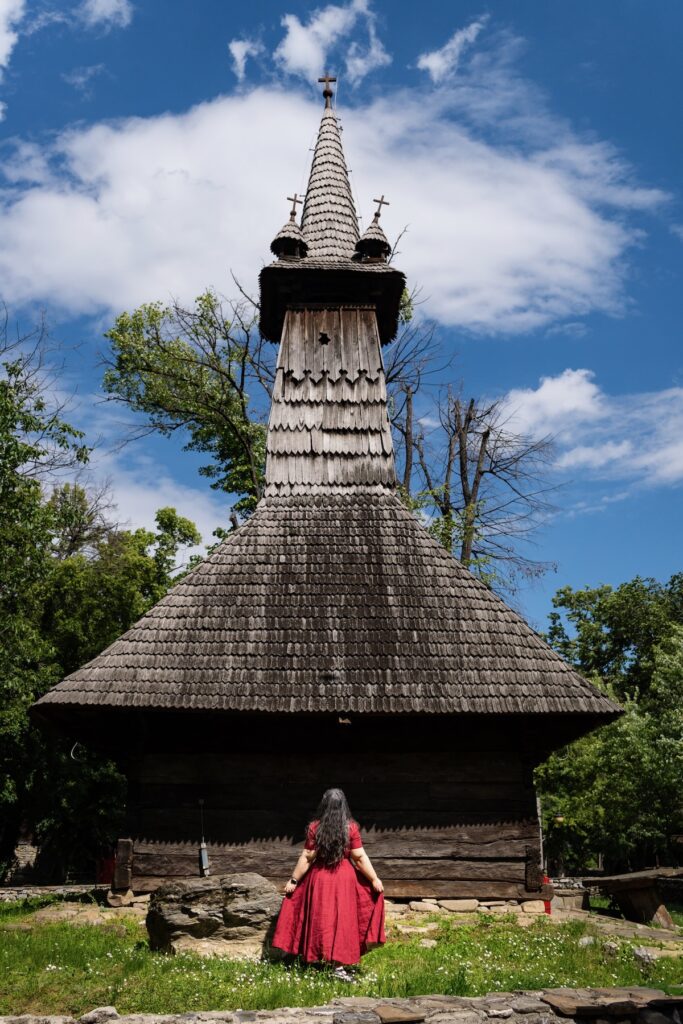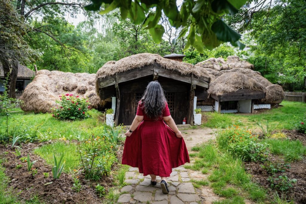 Devant un plan du parc, nous convenons avec Chouchou que l’endroit semble immense et que mon état de fatigue ne nous permettra pas de l’explorer entièrement. Nous décidons de nous concentrer sur les bâtisses représentées en jaune (celles qui sont originaires de la région de Transylvanie). Mais nous nous plaisons beaucoup dans ce lieu calme et reposant. Au final, nous devons en parcourir au moins les deux tiers. Je suis particulièrement séduite par les toitures aux silhouettes variées, tantôt élancées et couvertes de lamelles de bois en quinconce, tantôt trapues avec des tuiles en écailles de poisson, tantôt enfoncées dans le sol et faites de chaume. Ici comme dans le centre historique, nous apercevons pas mal de chats errants peu farouches, et même une vieille dame qui les nourrit près d’un banc.