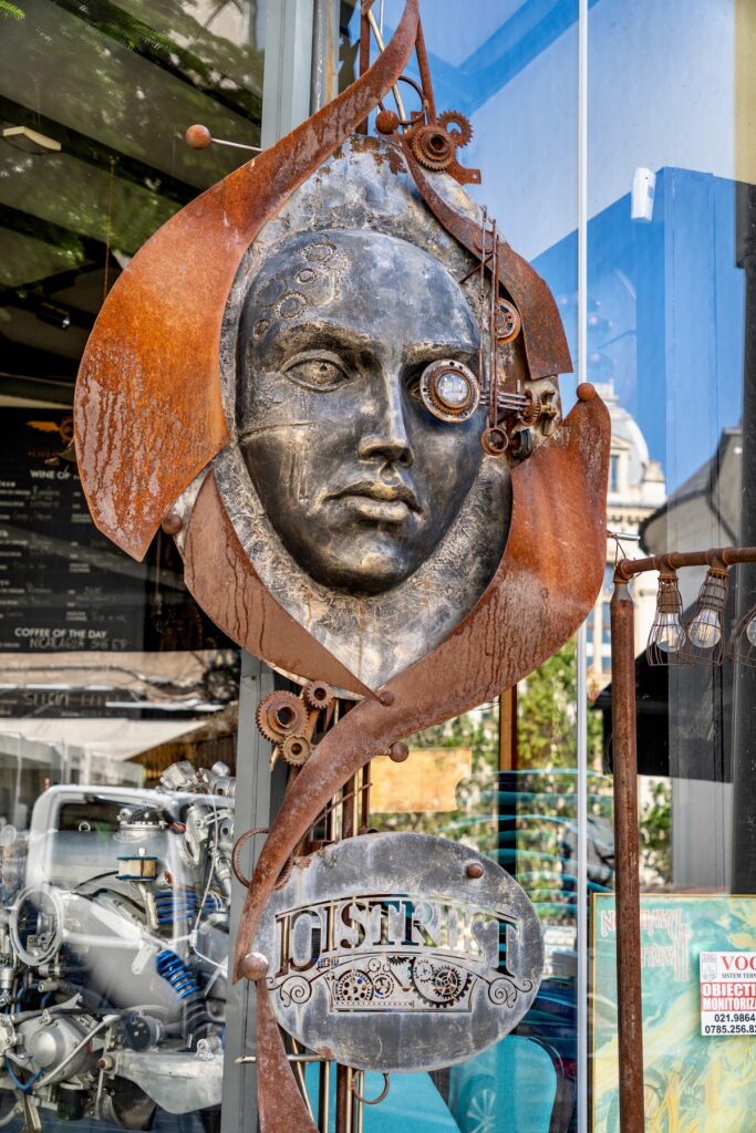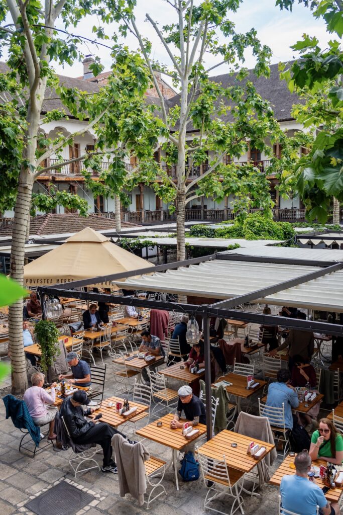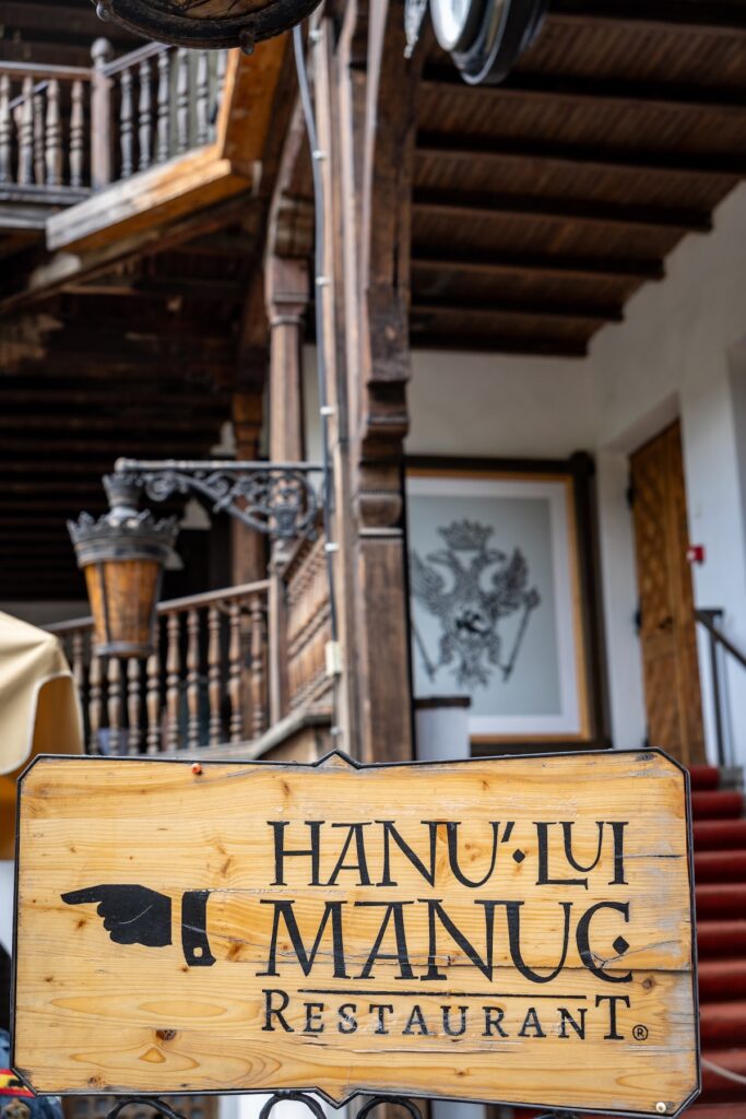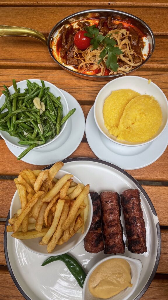 Quand je me sens un peu requinquée par cette pause, nous nous dirigeons vers la Piata Unirii. Il est déjà 13h15 et malgré mon manque d’appétit, nous nous posons dans la cour du Hanul’lui Manuc, une auberge qui propose de la cuisine typiquement roumaine. Chouchou tente les mici (saucisses à base de viande hachée et d’herbes), et moi l’agneau anatolien mijoté dans une sauce au paprika et servi avec de la crème aigre. C’est délicieux mais très riche; je ne parviens même pas à en manger la moitié. Pas d’inquiétude toutefois: le reste disparaît dans le trou sans fond qui sert d’estomac à Chouchou.