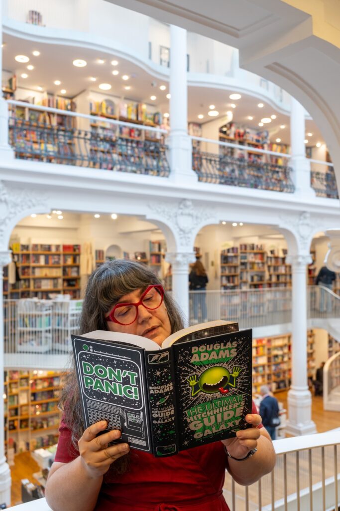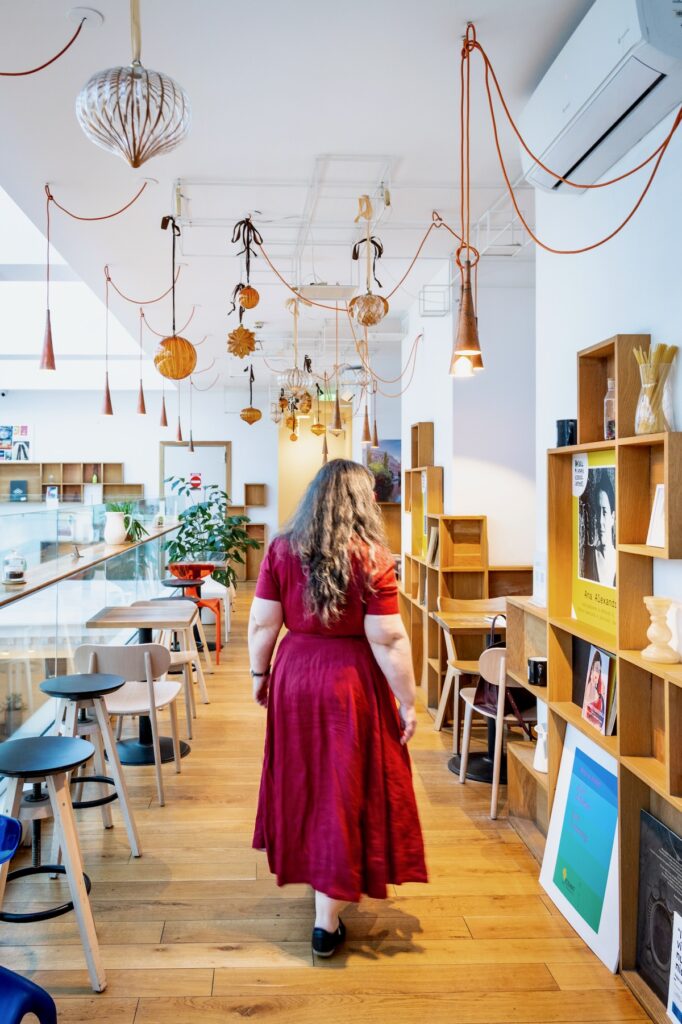 Nous aimons tout: le grand choix de livres en anglais – avec même un petit rayonnage de français et d’allemand -, les CD, les vinyles et le merchandising de séries et de films au sous-sol, l’espace exposition sur la mezzanine, le café zen au dernier étage… Nous passons autant de temps à tout fouiller que si nous étions dans un musée. Je repars avec trois petits broches d’artisans locaux, deux sachets de thé vert parfumé et un roman graphique culinaire. Dommage qu’il n’y ait pas de marque-pages publicitaire pour ma collection!