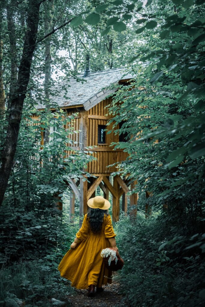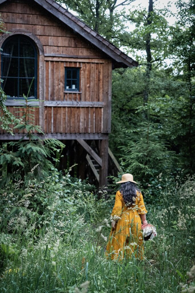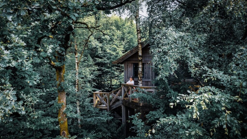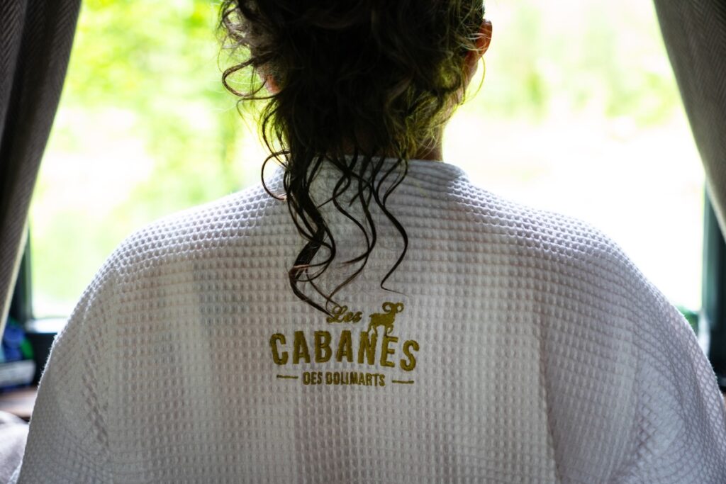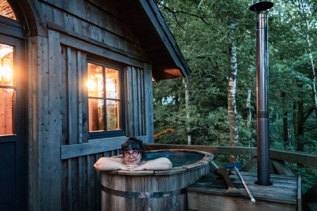 Nous nous sommes immédiatement sentis chez nous dans l’Amélia. Je l’ai trouvée particulièrement bien conçue, compacte avec ses 25 mètres carrés mais munie de tout le confort d’une chambre d’hôtel: lit king size de très bonne qualité, produits de bain Nuxe, linge brodé au nom du site… Sans parler du coin cuisine équipé et du canapé d’angle rustique face au poêle à bois. Le nécessaire, tout le nécessaire et seulement le nécessaire, avec en prime une belle terrasse, une vue merveilleuse sur la forêt et le chant des oiseaux pour unique bande-son.