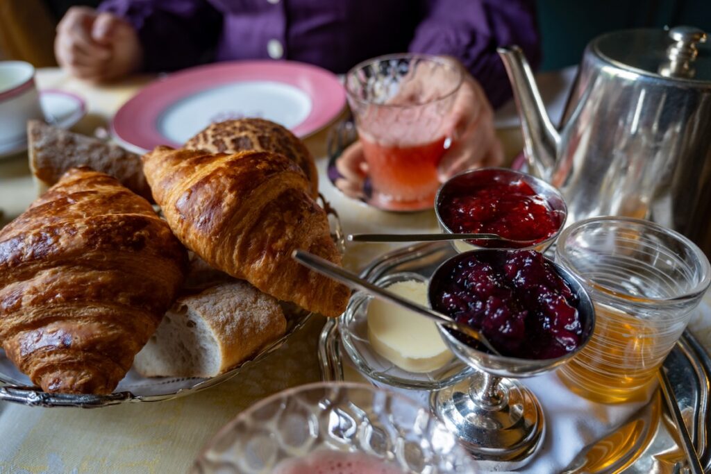 Nous avons fait l’impasse sur l’option piscine d’intérieur privatisée, et je ne suis pas intéressée par la mini-salle de sport du dernier étage. En revanche, je nous ai réservé deux petits déjeuners à l’horaire le plus tardif possible (10h30), pour pouvoir profiter de la chambre au maximum. Samedi matin, après nous êtes longuement prélassés dans l’immense lit très confortable de notre suite, nous finissons donc par descendre à la salle à manger. Une petite table a été dressée pour nous près d’une fenêtre. Nous y savourons un thé Mariage Frères, des viennoiseries et de pains accompagnés de confitures maison, ainsi que des oeufs qui arrivent sous de magnifiques couvre-plats.