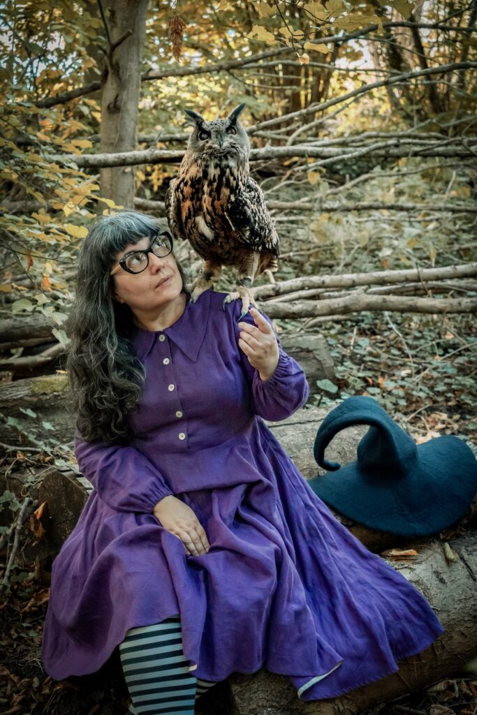 Pour conclure, nous sommes retournés un peu plus loin dans la forêt avec Apophis, grand duc mâle âgé de 17 ans au saisissant regard orange voilé par un accident qui a endommagé ses yeux. Apophis était le plus lourd des trois oiseaux avec lesquels j’ai posés – pas loin de 2 kilos, me semble-t-il -, aussi mon bras gauche n’a-t-il pas tardé à fatiguer. Mais c’était aussi le plus docile et le plus adorable. Cédric m’a dit que je pouvais le caresser, à condition d’éviter le sommet de sa tête. Bien entendu, je ne m’en suis pas privée. J’avais déjà touché énormément d’oiseaux morts (douteux privilège d’avoir un père chasseur), mais jamais un vivant et aussi magnifique de surcroît. Personne ne peut prouver que j’étais à deux doigts de m’enfuir en courant avec lui pour refaire ma vie en tant qu’ermite au fond des bois.