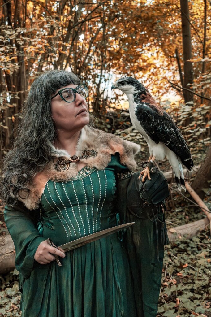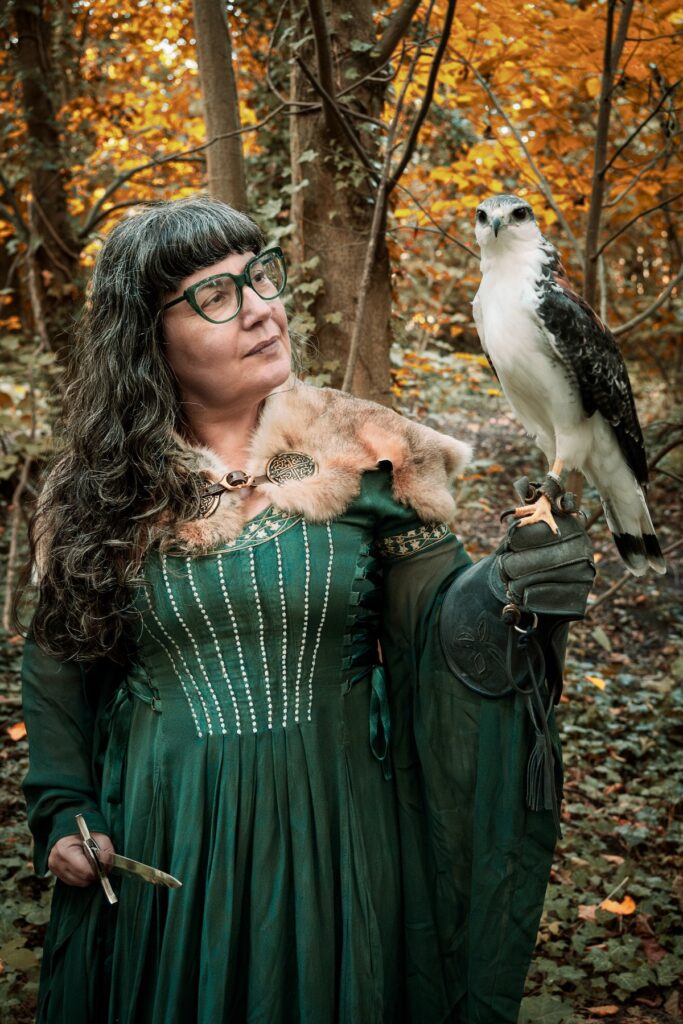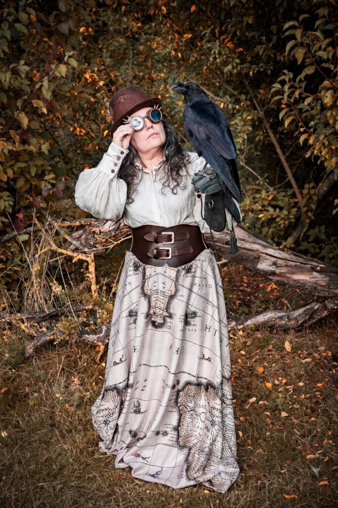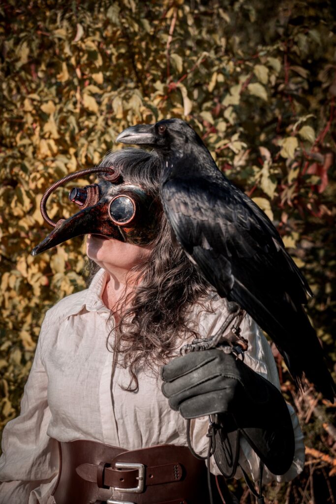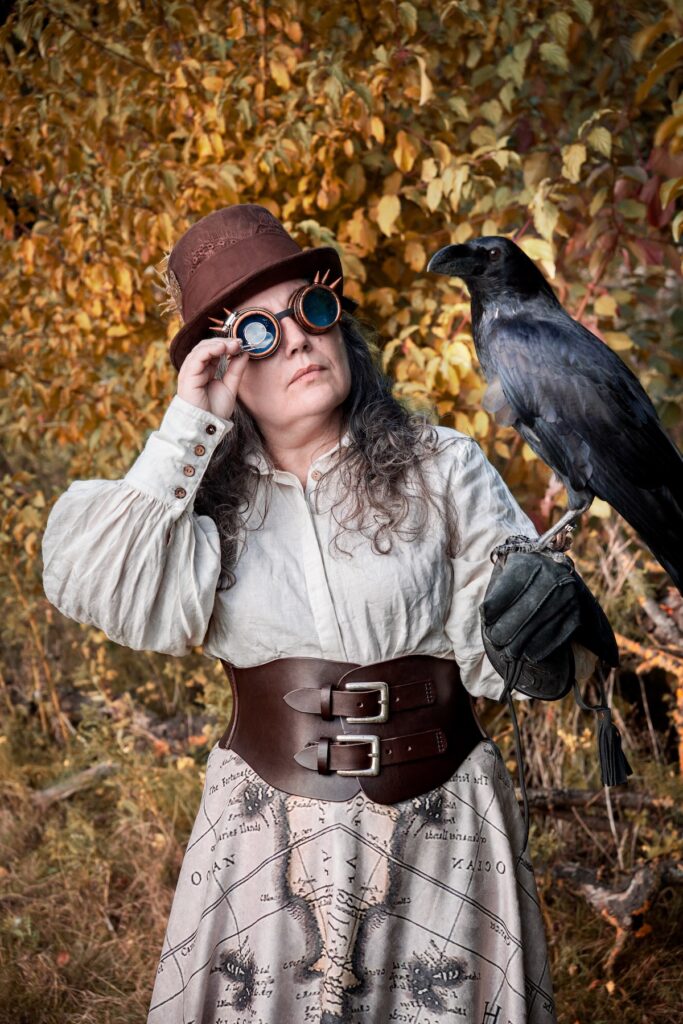 La série suivante s’est révélée un peu plus sportive: Makuu, corbeau femelle issue d’un croisement inattendu entre deux espèces (mais ressemblant surtout à son grand corbeau de papa), avait de l’énergie à revendre et pas une folle envie de rester immobile alors que le ciel lui tendait les bras. Ce que je comprends tout à fait. Elle m’a donné plein de coups de bec sur la main, et je me suis réjouie de porter un gant en cuir bien épais. J’ai attendu d’être dans le champ sélectionné pour enfiler mes accessoires steampunk; du coup je n’ai pas pu utiliser de miroir pour m’aider, et je me suis beaucoup embrouillée dans mes propres cheveux. Les risques du métier.
