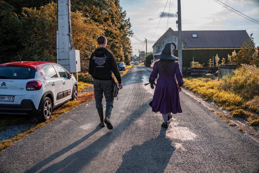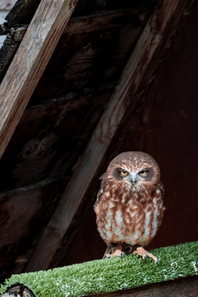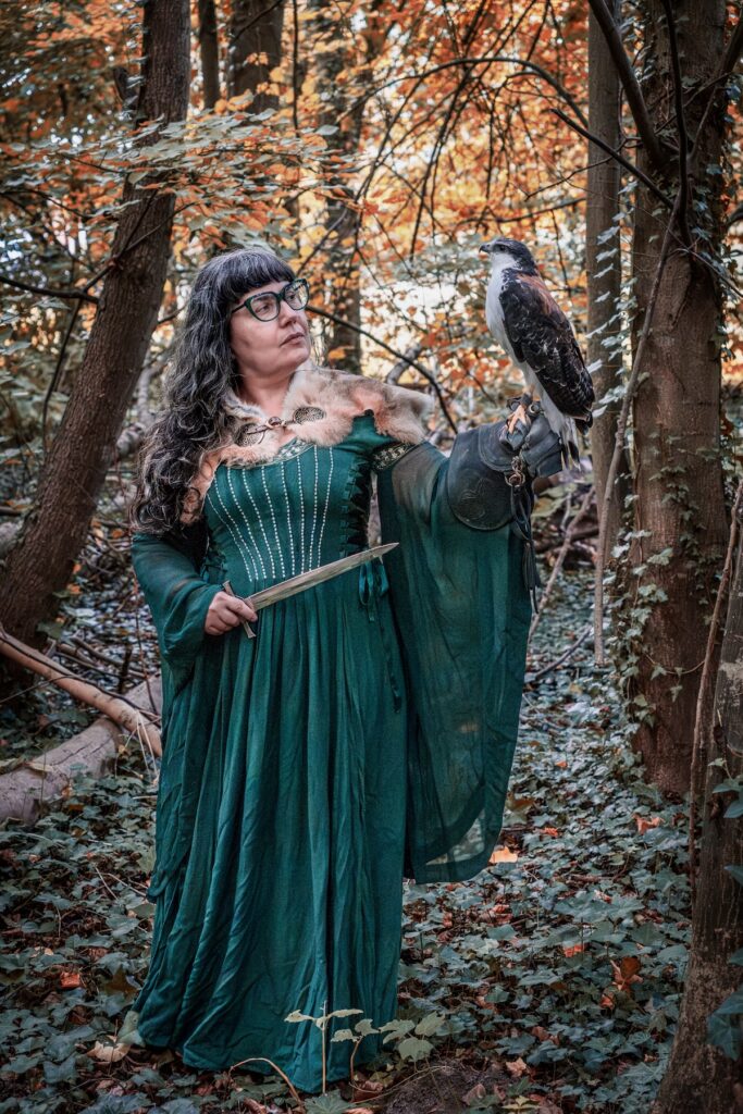 Samedi dernier, nous nous sommes donc rendus à Lessines avec deux gros sacs pleins de costumes et d’accessoires dans le coffre d’une Cambio prémonitoirement couverte de fientes de pigeon. Nous sommes arrivés bien en avance par rapport à l’heure convenue, mais Cédric nous a très gentiment laissés entrer et commencer à nous installer. Nous avons convenu ensemble des oiseaux que Chouchou et moi souhaitions utiliser, puis Cédric nous a fait faire un tour du propriétaire en nous montrant les endroits les plus photogéniques que ses visiteurs choisissent d’utiliser comme cadre pour leurs photos. Enfin, il m’a donné accès à une petite pièce où je pouvais me changer, et fourni le gant de fauconnerie indispensable pour ne pas me faire labourer la main par certains rapaces.