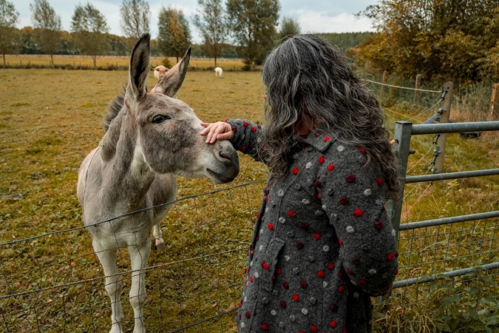 C’est à travers leur compte Instagram que j’ai découvert l’existence de Faunessence et la possibilité d’y organiser des séances photos. Situé dans la campagne wallonne, à une demi-heure de route depuis la sortie de Bruxelles, ce site privé est dirigé par un couple d’amoureux des animaux: Cédric, soigneur qui a travaillé 10 ans à Pairi Daiza, et Catherine, éducatrice spécialisée. Sur leur terrain de 250 hectares, ils accueillent des oiseaux issus de sauvetages, mais aussi des animaux de la ferme (vaches, ânes, moutons, chèvres, poules…) – en tout, plus de 250 bestioles à poil ou à plumes qui nécessitent 4 heures de soins quotidiens.