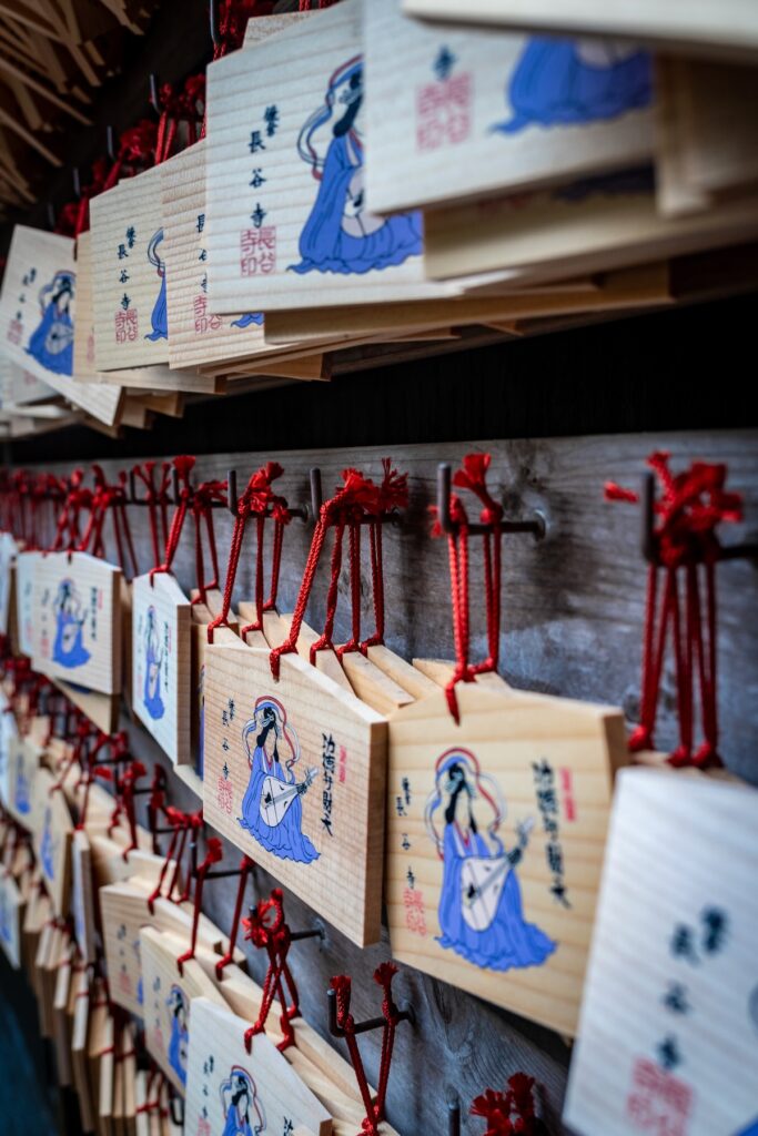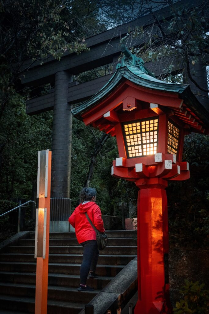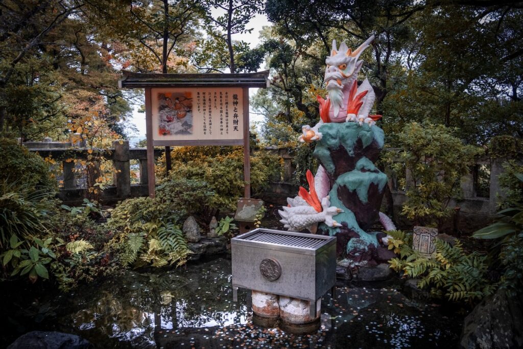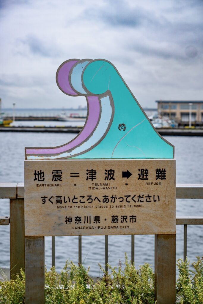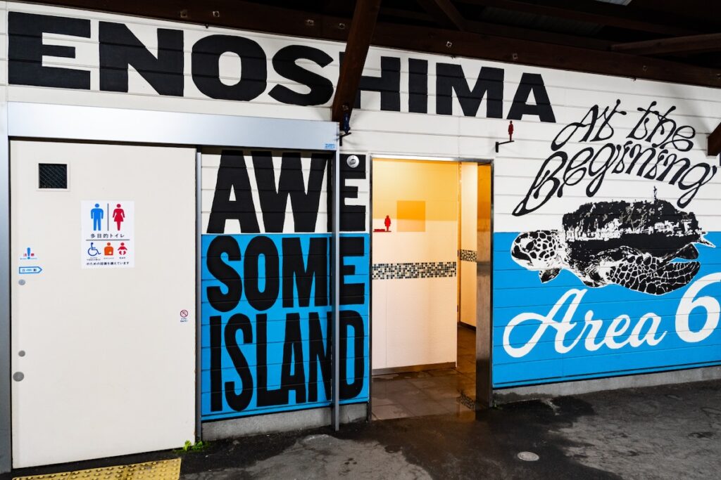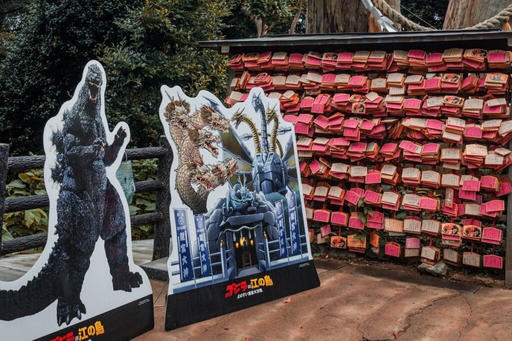 C’est encore l’Enoden Line qui nous emmène jusqu’à Enoshima. Tandis que nous longeons la côte, j’aperçois des dizaines de surfeurs dans l’eau là où ils ont pied, en train d’attendre des vagues inexistantes. Et à la sortie de la gare, je m’amuse de voir que les oiseaux vêtus de bavoirs au crochet sont toujours perchés là.