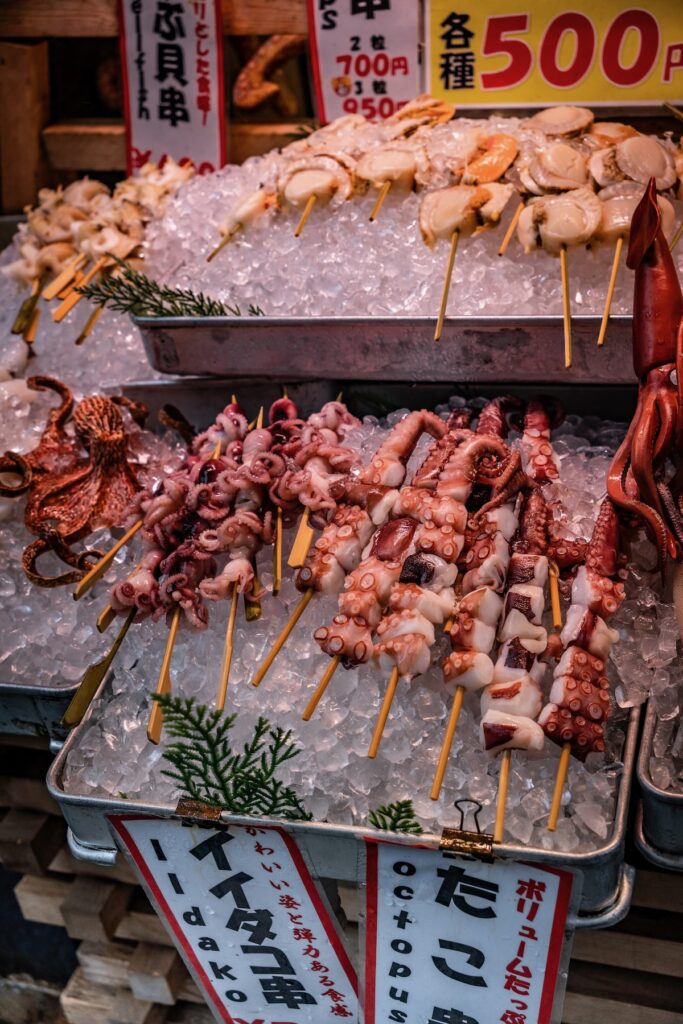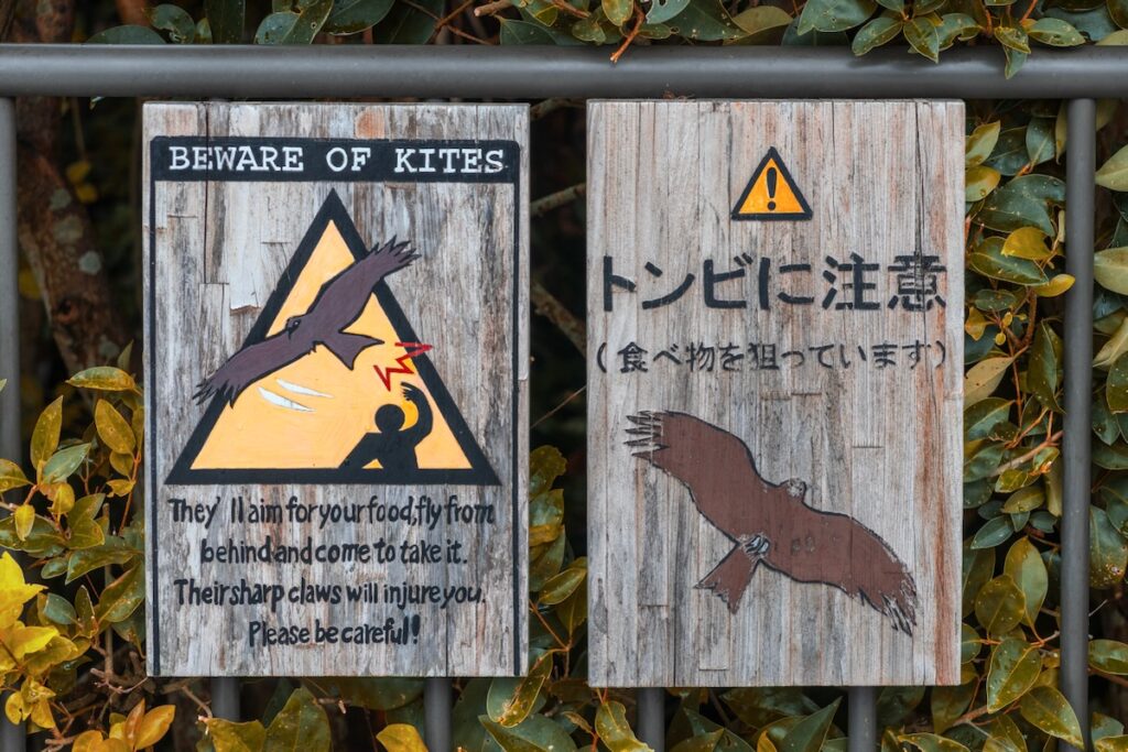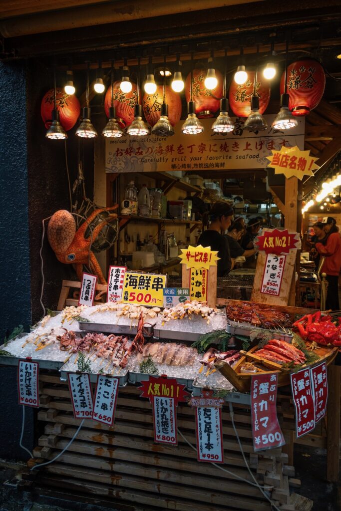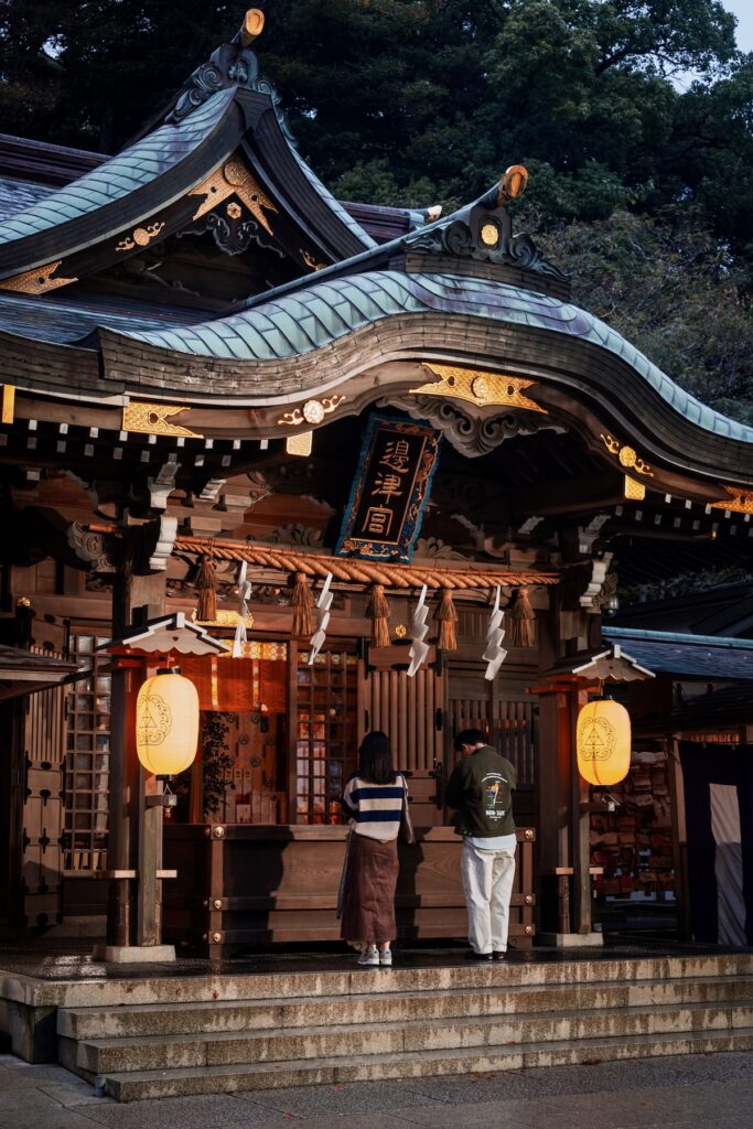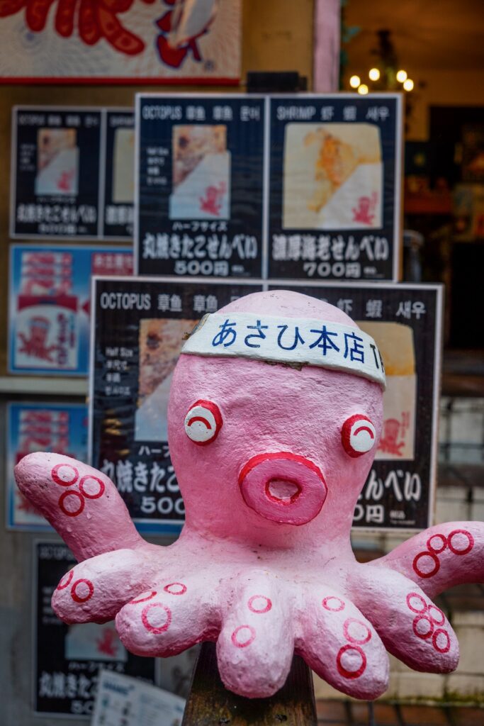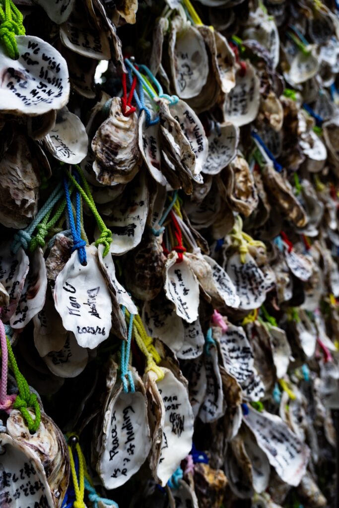 C’est encore l’Enoden Line qui nous emmène jusqu’à Enoshima. Tandis que nous longeons la côte, j’aperçois des dizaines de surfeurs dans l’eau là où ils ont pied, en train d’attendre des vagues inexistantes. Et à la sortie de la gare, je m’amuse de voir que les oiseaux vêtus de bavoirs au crochet sont toujours perchés là.