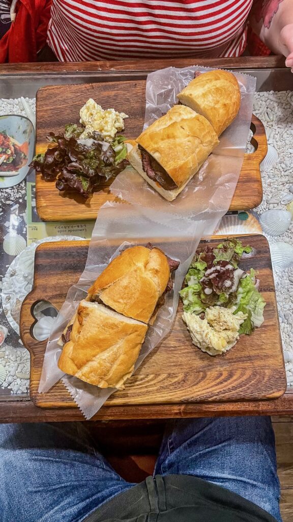 En rebroussant chemin vers la gare, nous nous arrêtons pour manger des steaks sandwichs très bons, mais aussi chers que notre menu complet de ce midi. Et arrivée à la caisse, je découvre qu’ils ne prennent que le cash – argh.