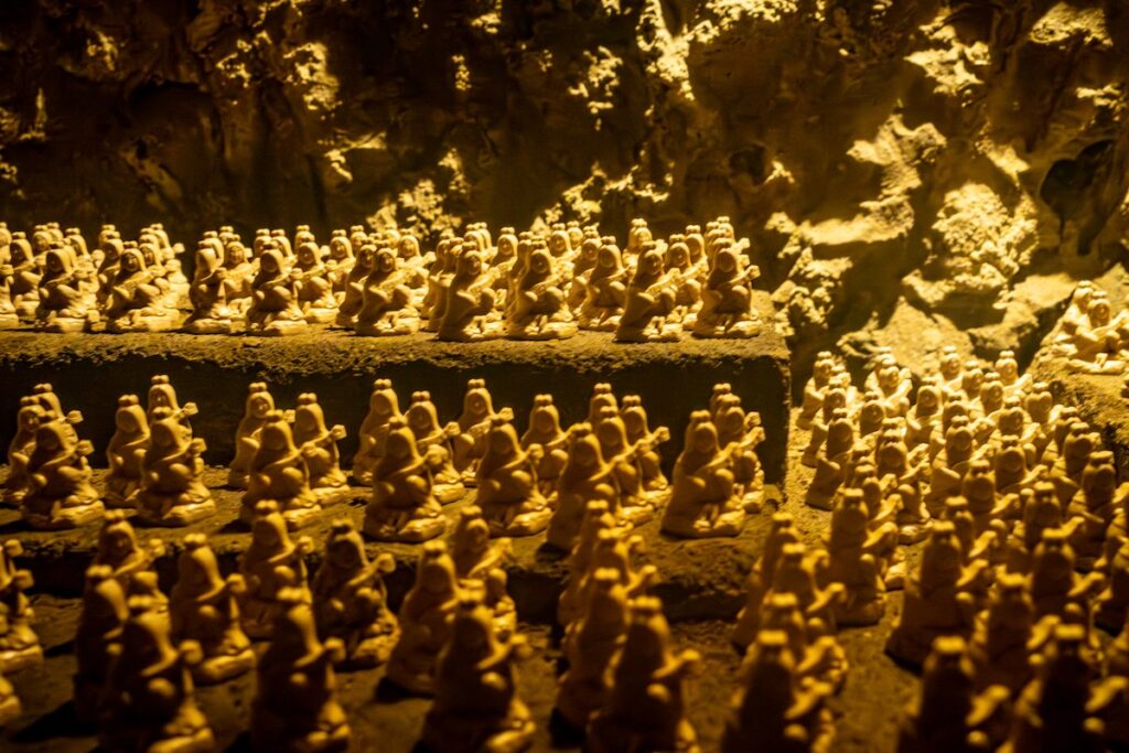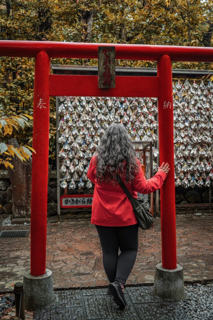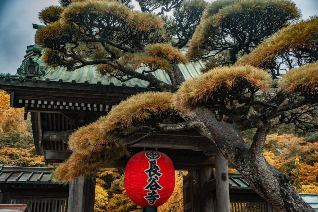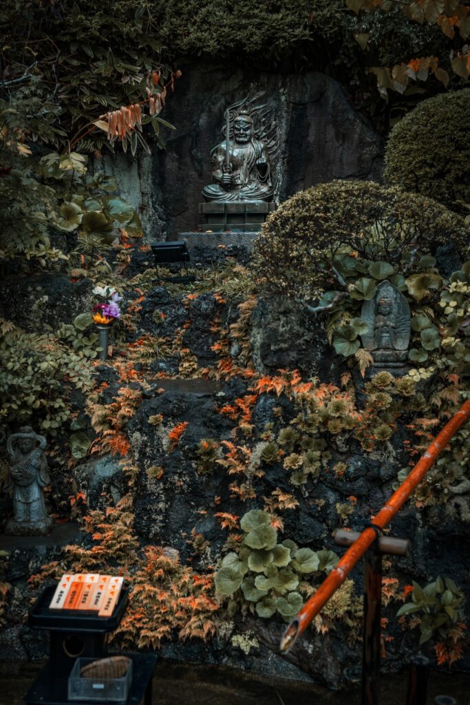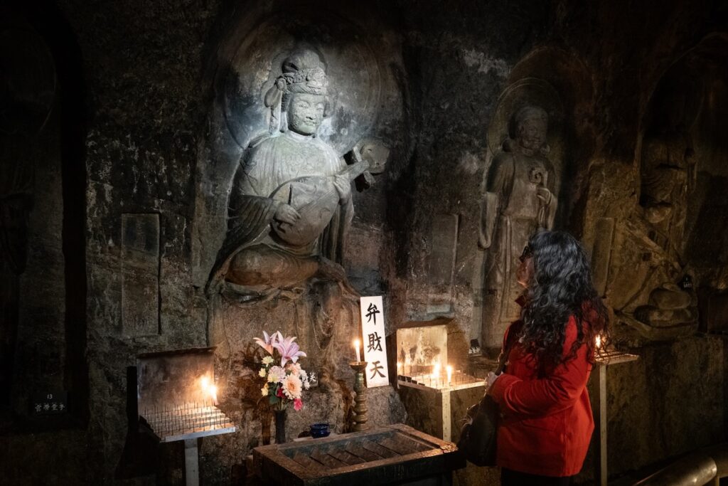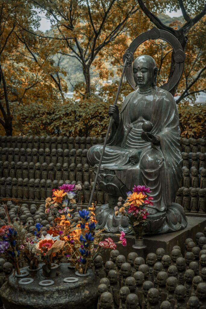Nous prenons ensuite le petit train vert de l’Enoden Line pour nous rendre au temple Hasadera, sans doute le plus fréquenté de Kamakura. Il se révèle très grand et très impressionnant, avec une grotte dans laquelle même moi, je dois avancer courbée pour ne pas me cogner la tête au plafond.