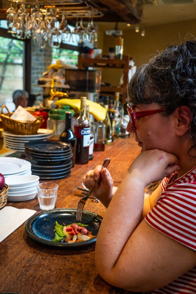 Nous mettons ensuite près d’une demi-heure à rejoindre Komachi dori à pied; c’est une marche longue et plutôt ennuyeuse. La rue elle-même me fait penser à Yanaka Ginza, mais en mieux (et avec moins de monde grâce à la météo). Au fond d’une ruelle perpendiculaire, nous dénichons un improbable resto italien nommé Ran’s. Installé à un beau comptoir en bois massif, nous regardons quatre jeunes cuisiniers nous préparer un repas succulent: potage de butternut, antipasti de thon cru et de rosbeef + polenta, spaghetti bacon et légumes locaux, plus une boisson chaude à la fin, le tout pour à peine 3000 yens (dans les 18 euros). Ca mérite bien que je me fende d’un « gochisôsama! » en partant.