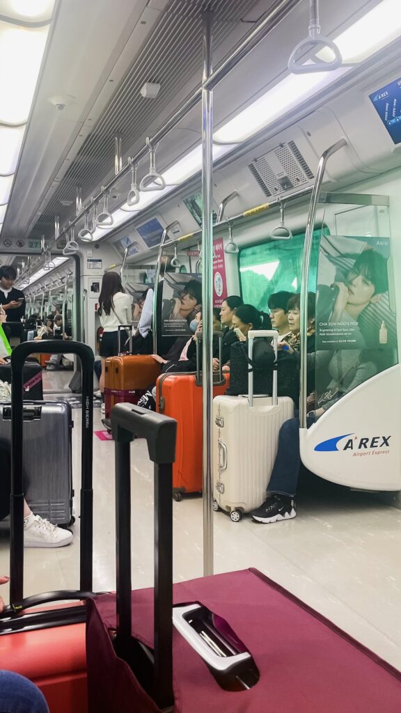 Nous achetons deux tickets à un distributeur et montons dans le All-Stop Train qui dessert en un peu moins d’une heure l’aéroport d’Incheon, plus éloigné de Séoul que celui de Gimpo où nous sommes arrivés depuis Tokyo.