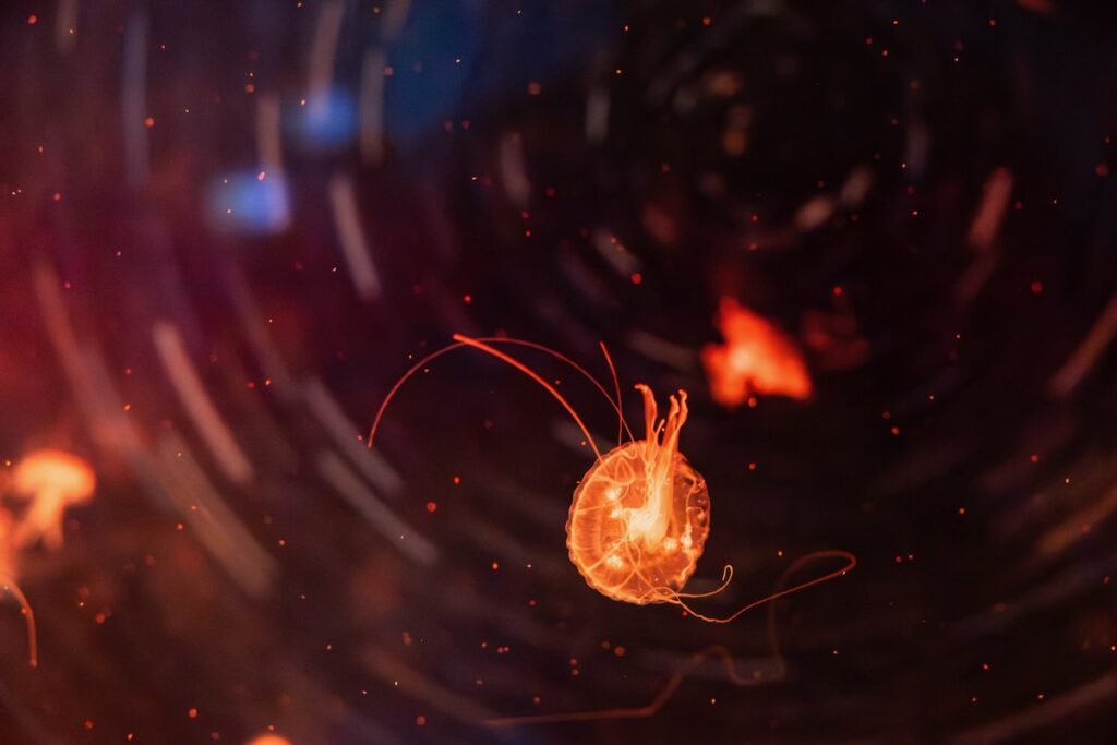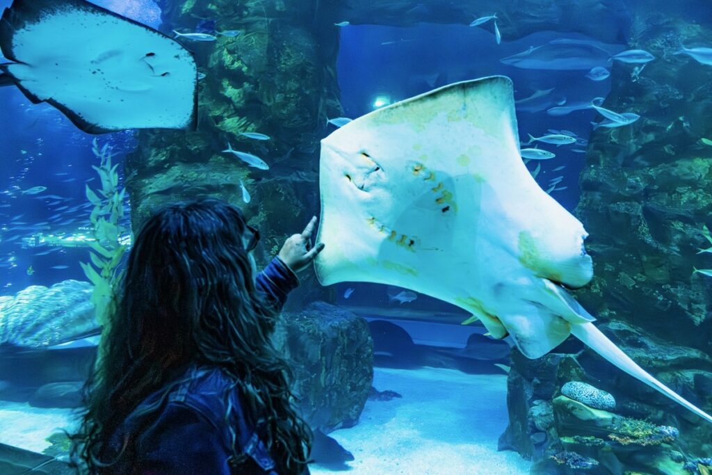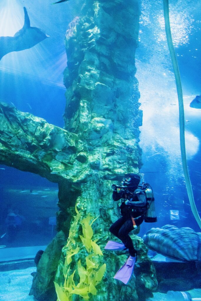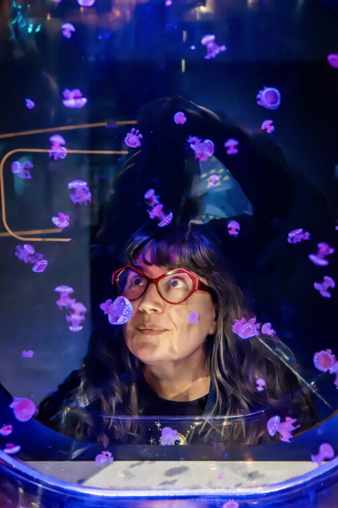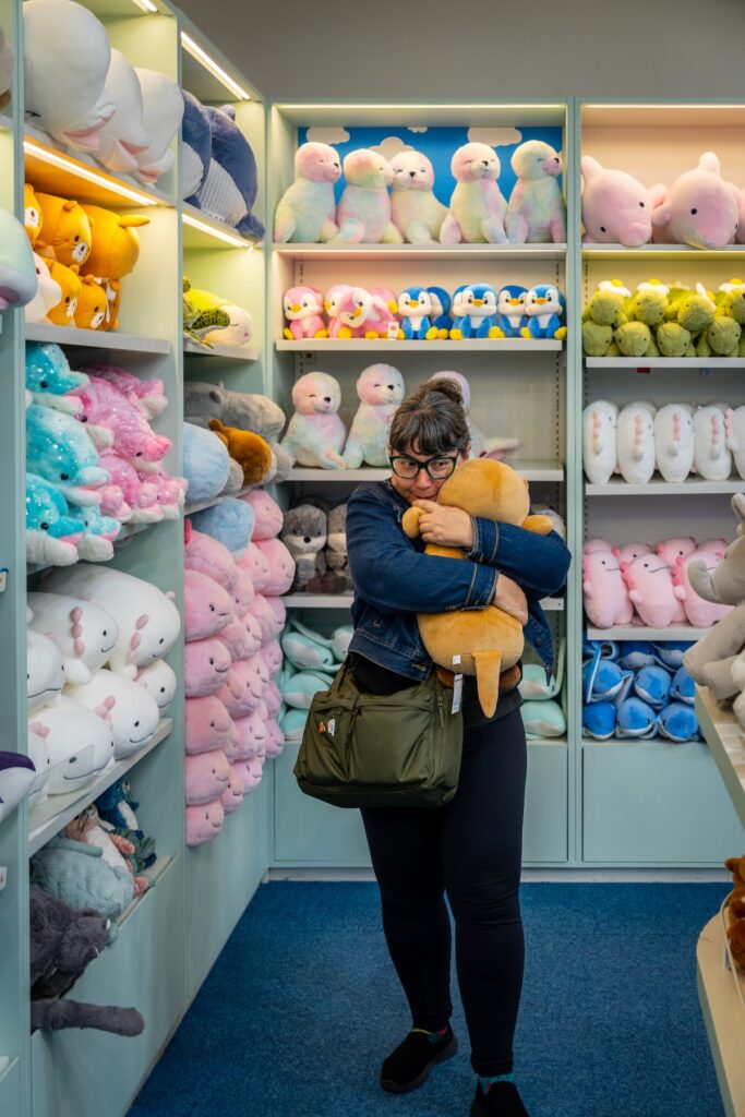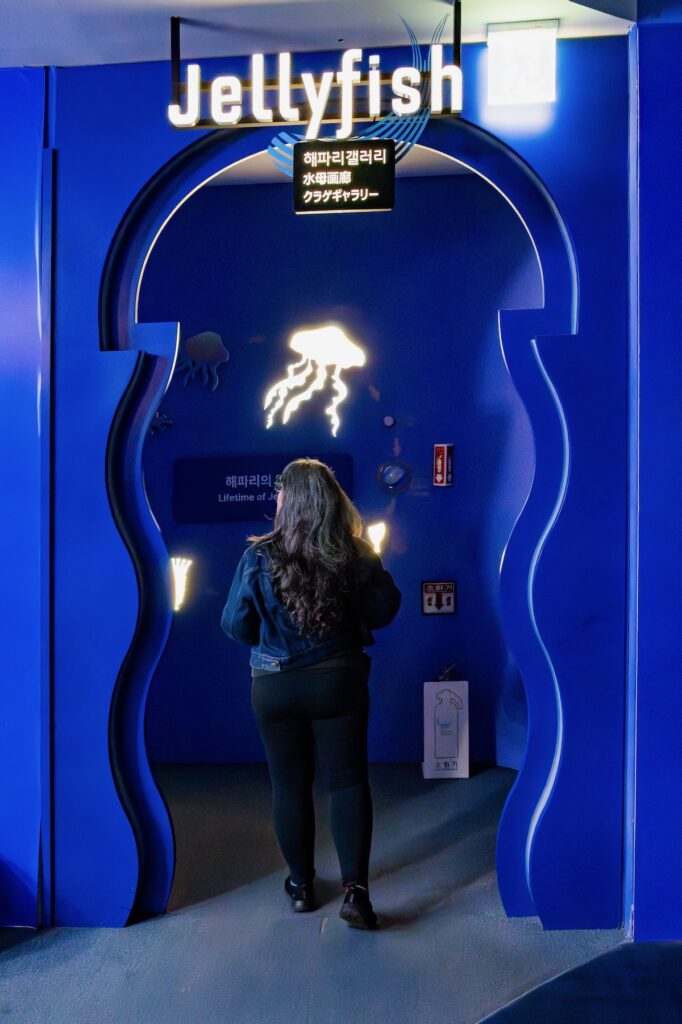 Puis on passe à l’Aqua Shop accessible depuis l’extérieur de l’aquarium, et là, miracle: ils ont aussi ma loutre! Il leur en reste un seul exemplaire, donc je l’achète tout de suite et je le trimballe pendant la visite. J’aurai vu 3 fois des méduses en l’espace de 2 semaines – c’est un record personnel. Je me sens également développer un intérêt nouveau pour les raies et les axolotls. Je m’en voudrais d’infliger ça à Chouchou s’il n’était pas toujours content de pouvoir prendre des photos dans des conditions inhabituelles.