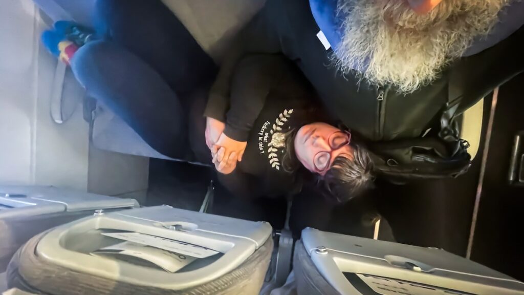 Nous embarquons à l’heure prévue. L’avion n’est pas plein, et nous avons une rangée de trois pour nous tout seuls, ce qui me permet de m’allonger avec la tête sur les genoux de Chouchou. Avec l’aide d’un Témesta, je passe l’essentiel du vol à dormir.