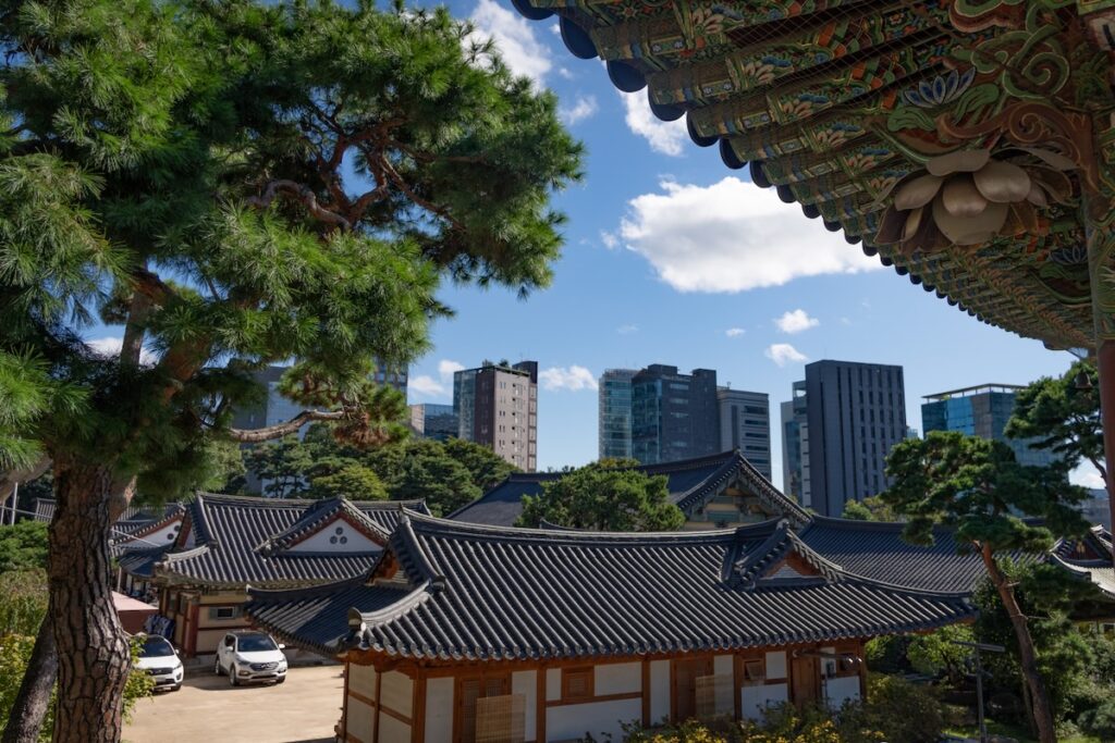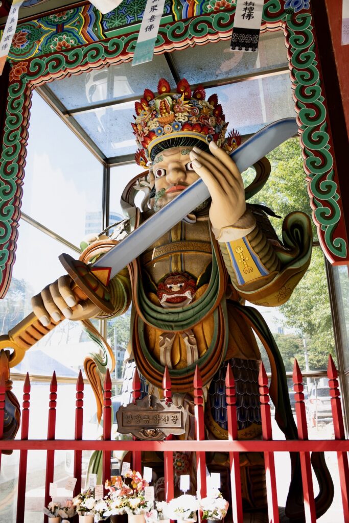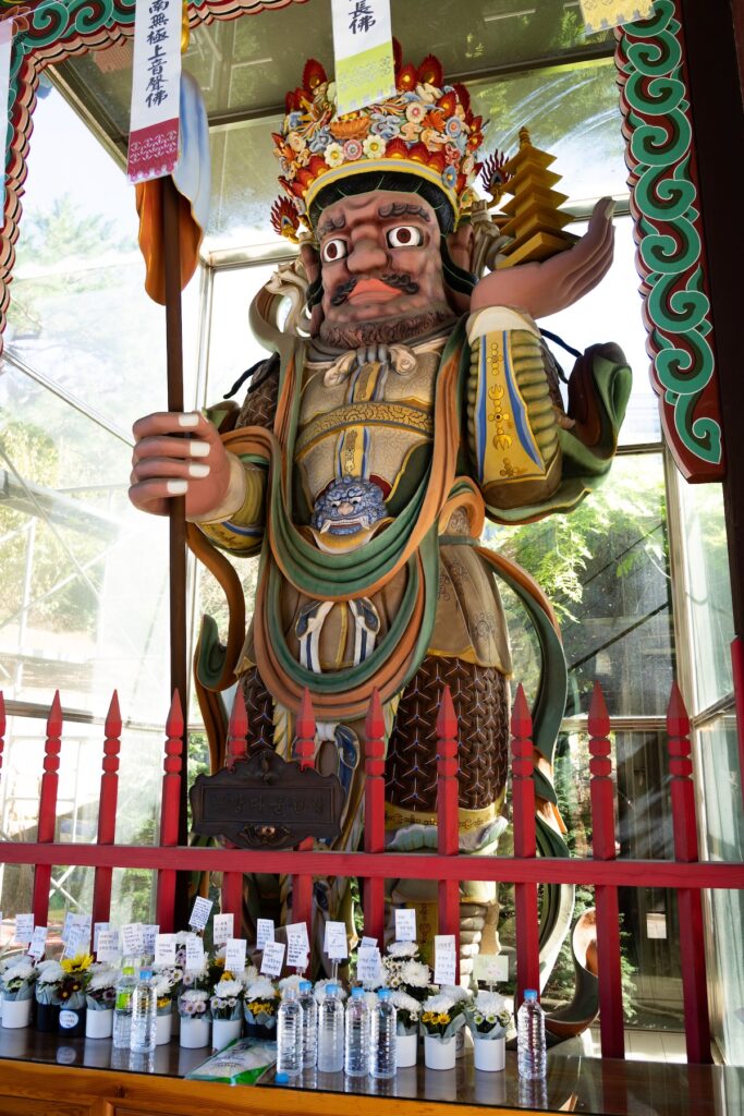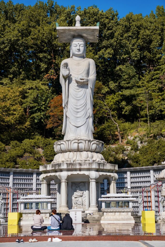 Départ vers 9h20 sous un beau ciel bleu pour le temple bouddhiste de Bong Eun Sa. Une heure plus tard (dont la moitié passée à marcher dans les couloirs du métro), on débarque sans faire exprès en plein service religieux. On fait quelques photos du grand Bouddha debout; dommage qu’il tourne le dos à une colline plutôt qu’aux gratte-ciel de Gangnam car ça aurait fait une image spectaculaire.