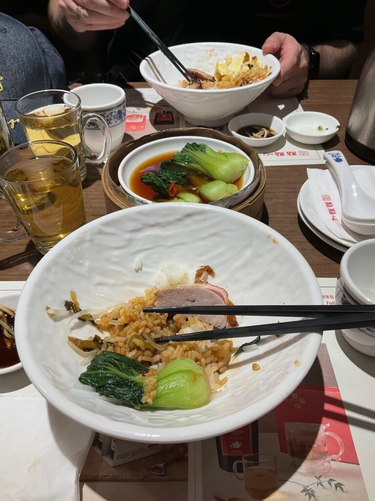Crevés, nous dînons de bonne heure au food court du -1, dans un resto de dim sum qui a du thé au jasmin à la carte. C’est le premier thé vert que je trouve depuis notre arrivée en Corée (et ce sera le seul – ici, les gens boivent du café; à la limite, de l’Earl Grey ou de la camomille). Il nous est apporté dans une drôle de théière en plastique transparent, avec laquelle on se sert en la posant sur une tasse et en faisant pression sur le fond. Quant à la nourriture, elle est très bonne, coûte ridiculement peu cher et arrive rapidement sur notre table.