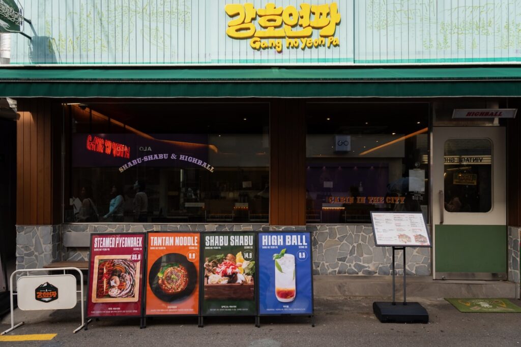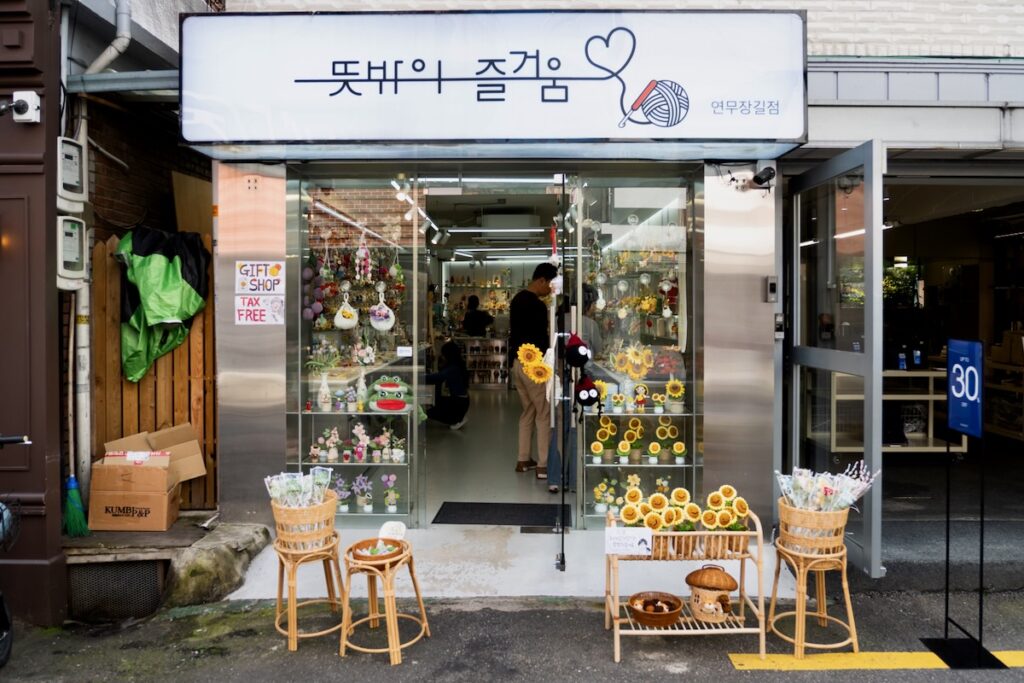 Un peu plus loin dans la même rue, face à une boutique de mignonneries au crochet que je dévaliserais bien si j’avais un peu plus de place dans mes bagages, nous tombons sur un resto de shabu shabu presque vide, le Gang ho yeon pa. Nous nous attablons devant des plaques individuelles autour du comptoir. Je prends un bouillon tantan un peu épicé et Chouchou un bulgogi. On se régale, mais en sortant, je me rends compte que mon grapefruit highball devait être un peu plus alcoolisé que je ne l’ai cru sur le coup car je suis légèrement pompette.