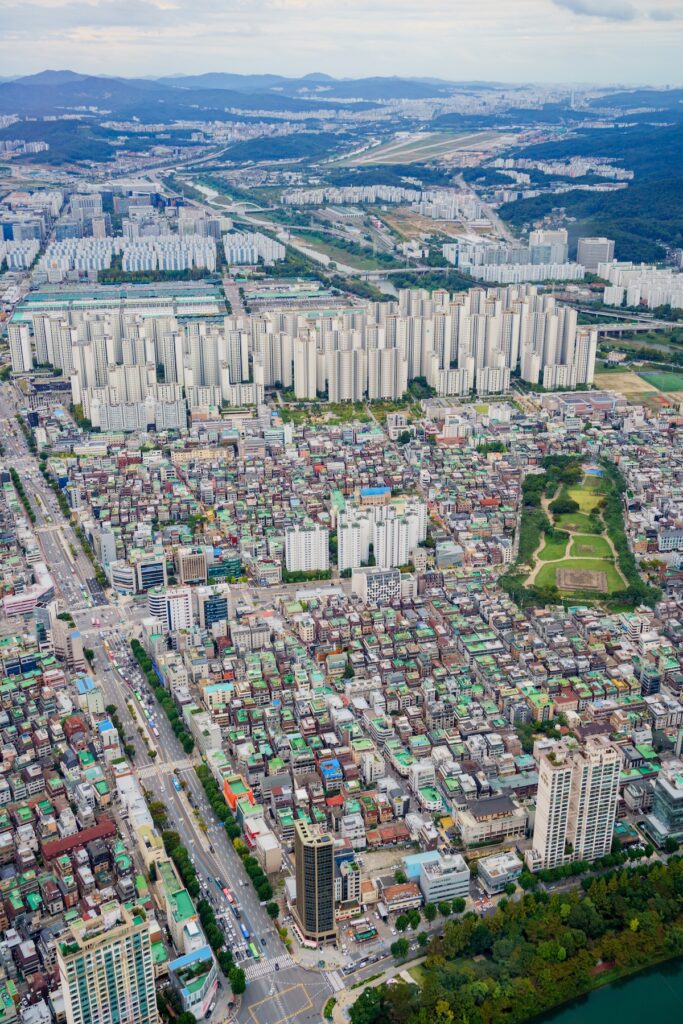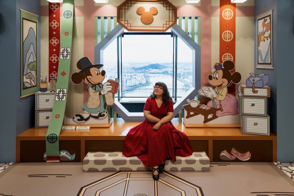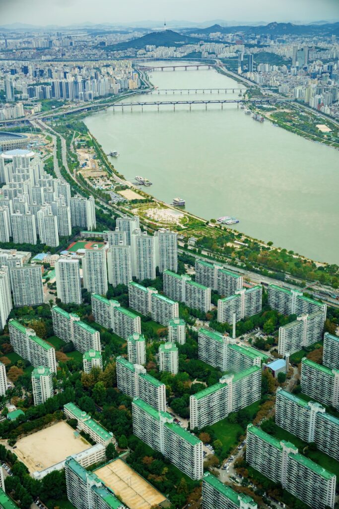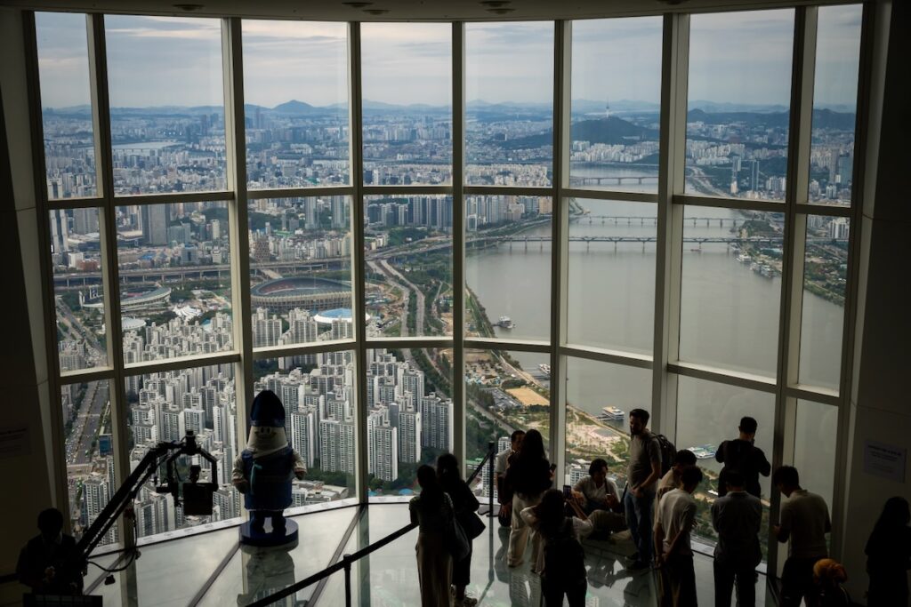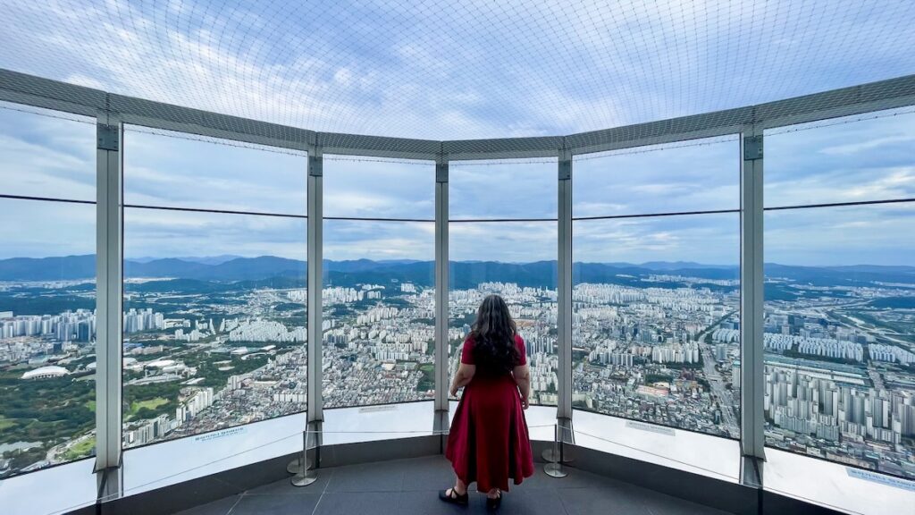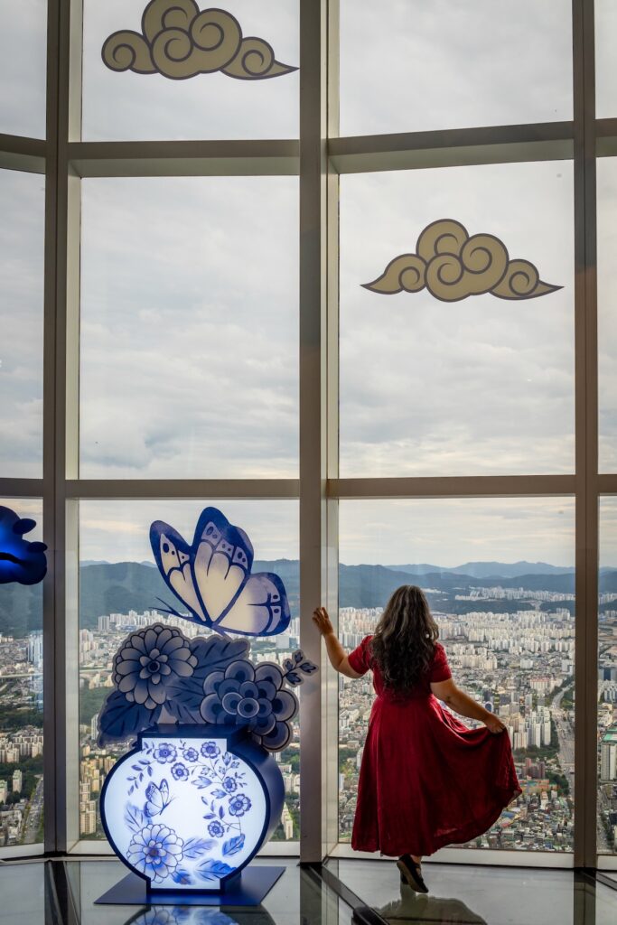 Nous montons au Seoul Sky, soi-disant le meilleur point de vue sur la ville. Avec ses 122 étages, la Lotte World Tower est le 7ème plus haut bâtiment du monde. De son sommet, on se rend bien compte à quel point Séoul est globalement moche avec ses gros paquets de gratte-ciel identiques, entrecoupés de bâtiments plus petits au toit plat et vert. Beaucoup de collines boisées intactes forment de gros trous au milieu du tissu urbain. Même si je passe de bonnes vacances, je détesterais vivre ici. Sans parler de l’aspect esthétique, tout est loin de tout et se déplacer prend des plombes (quoi que sans doute un peu moins si on utilise le bus, ce que j’ose rarement faire à l’étranger à moins d’y être obligée).