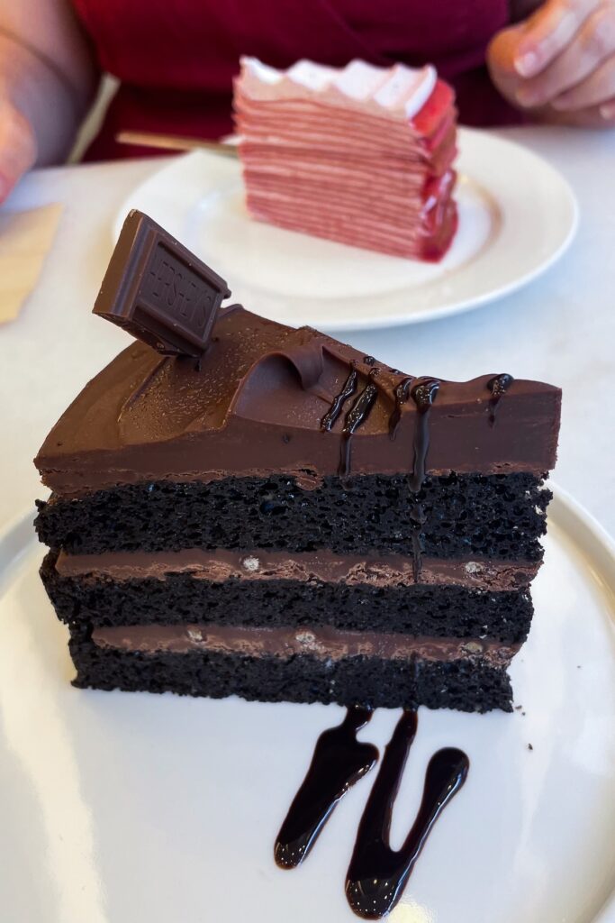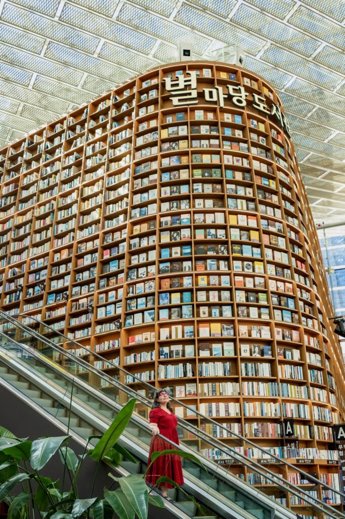 De l’autre côté de la rue, le COEX Mall abrite la Starfield Library, une de mes motivations principales pour ce voyage. C’est un lieu vraiment spectaculaire avec ses immenses murs de livres, ses longs escalators jumeaux et son plafond qui laisse entrer la lumière du soleil en la découpant en faisceaux. Nous en faisons plusieurs fois le tour en cherchant l’accès à ce que nous prenons pour un café (et qui est en fait un simple balcon). Ce faisant, nous tombons quand même sur une pâtisserie où je ne résiste pas à un mille crêpes à la fraise et Chouchou à une monstruosité chocolatée. Quoi que bourré d’Instagrameurs, le lieu est magnifique d’un point de vue architectural, et nous sommes très satisfaits d’avoir pu shooter ici. Avant de partir, je demande à la fille derrière le comptoir des renseignements: « Et comment on fait pour attraper les livres du haut? » « Ils sont juste là pour la déco », me répond-elle. Il me semblait bien.