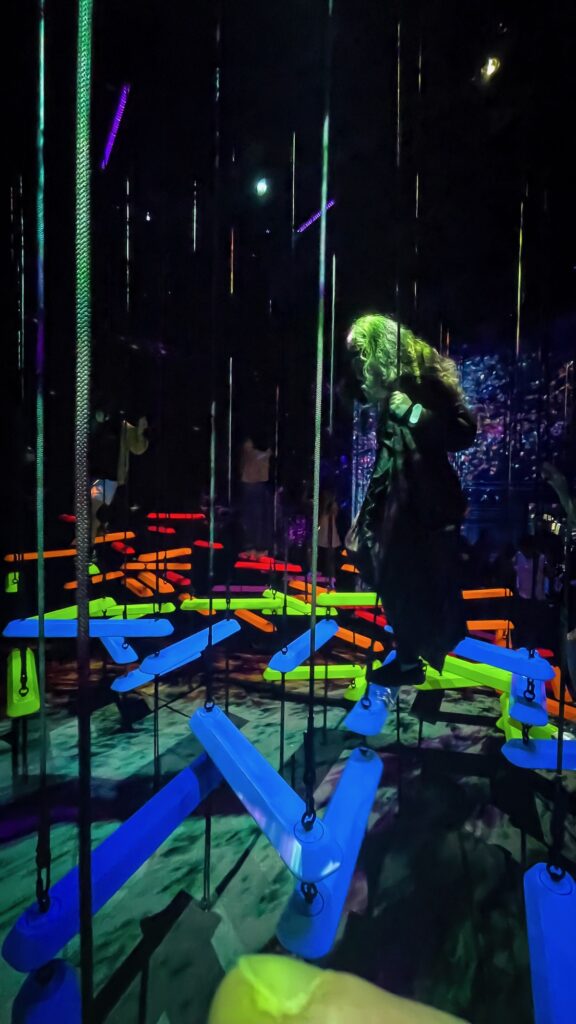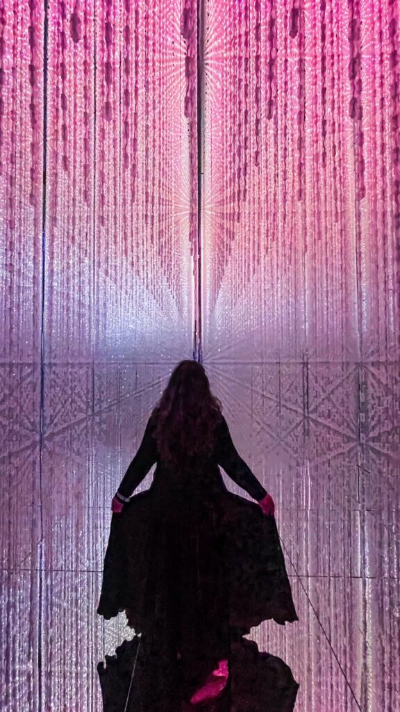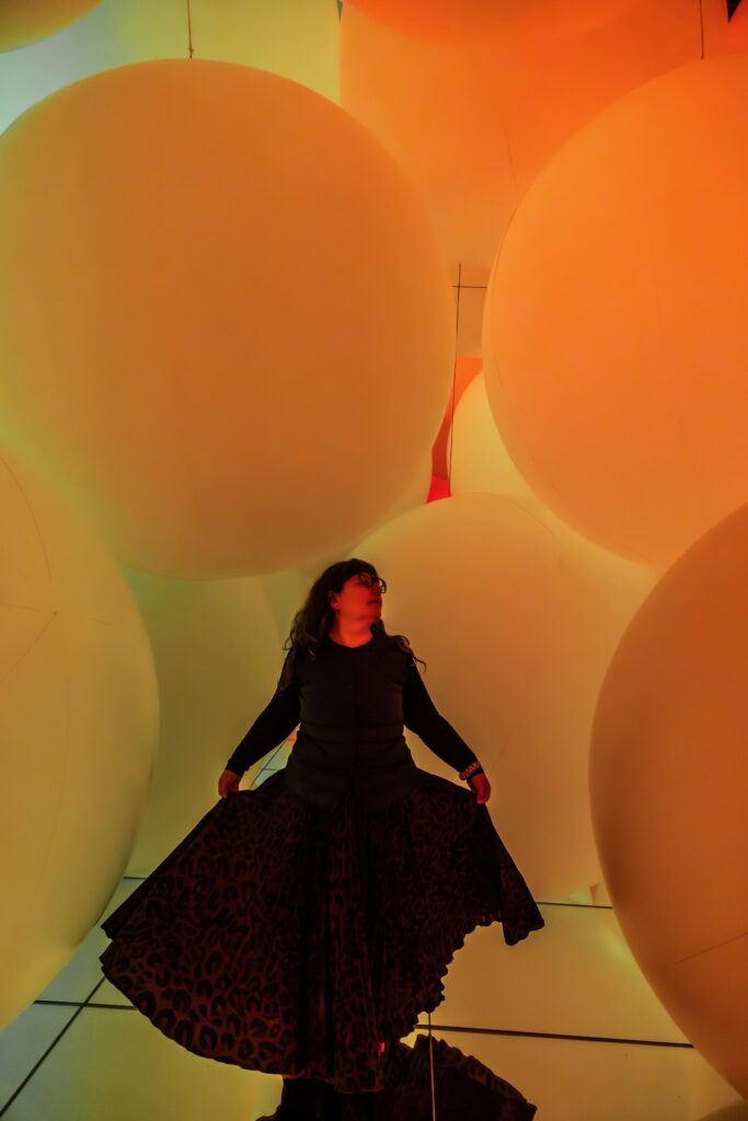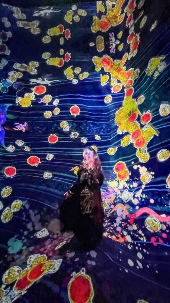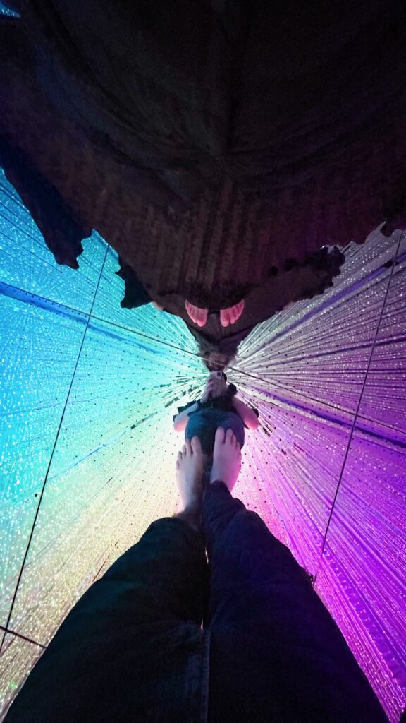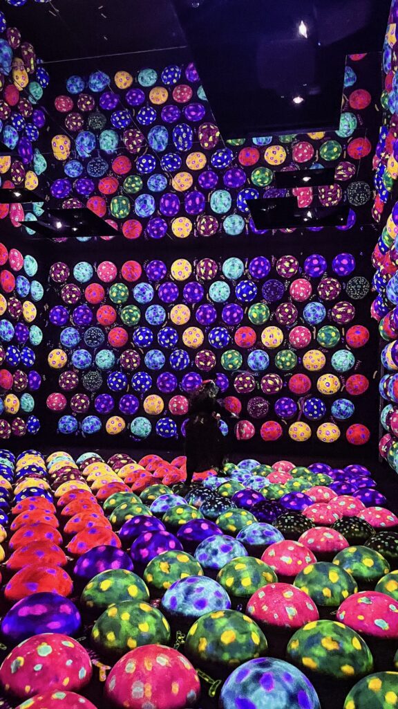 TeamLab Planets: comme toujours dans ce genre d’exposition, mes impressions sont mitigées. Nous marchons pieds nus et pataugeons dans l’eau jusqu’aux genoux. La pièce des fleurs empeste la rose, et l’animation vidéo me donne le vertige. Je me ridiculise dans la partie sportive avec ma jupe longue et mes cheveux lâchés qui entravent mes mouvements. Mais Chouchou en tire quelques chouettes photos, essentiellement dans des salles au principe vu et revu cent fois, tels les rideaux de petites lumières ou les ballons géants. Je ne referai pas d’autre événement de la même franchise (ils sont très nombreux en Asie; il y en a plusieurs rien que dans Tokyo).