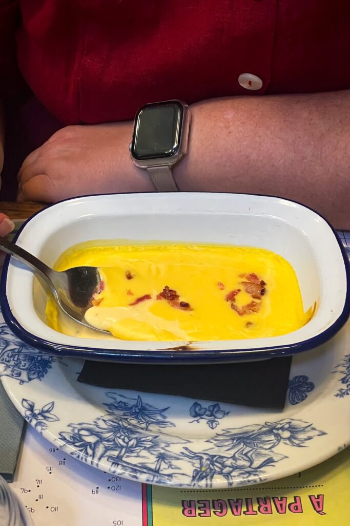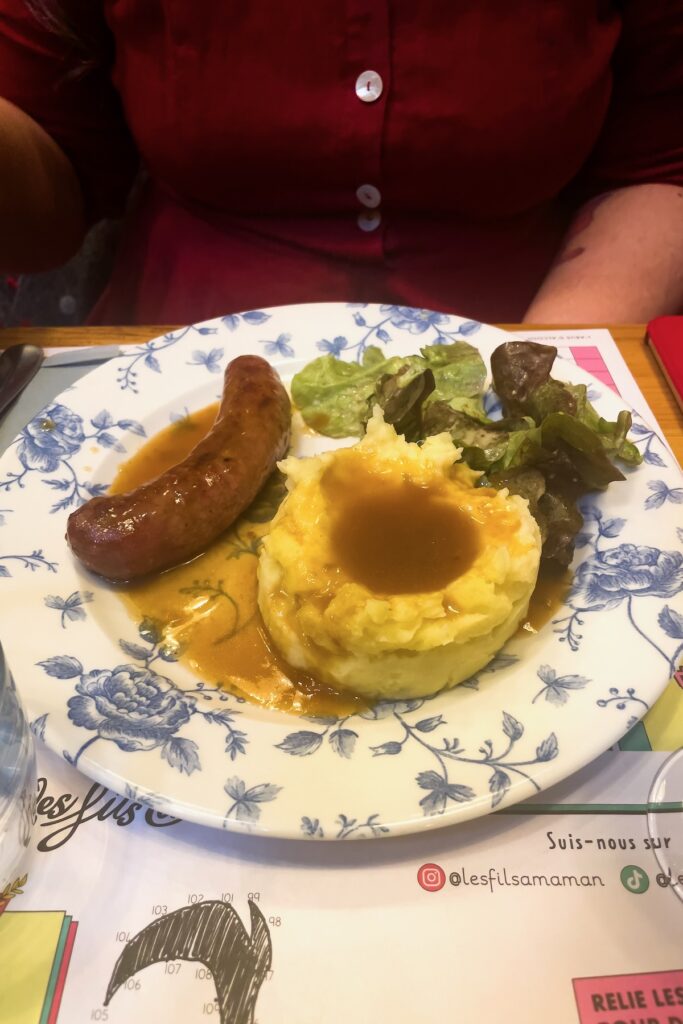 Je finis par opter pour une valeur sûre: Les fils à maman. La serveuse seule est débordée, et plus de trois quarts d’heure s’écoulent entre notre arrivée et le moment où nous recevons enfin notre commande. Mais au moins, on mange bien. Mention spéciale à ce petit velouté de butternut au bacon dont j’aurais volontiers piqué la recette.
