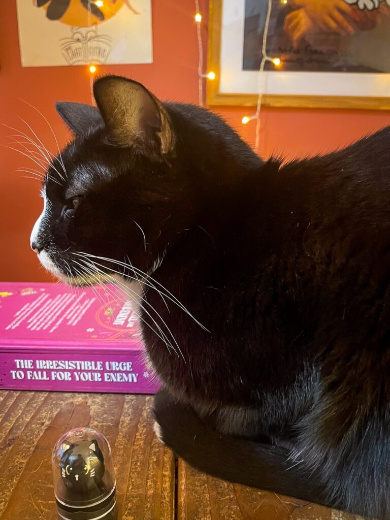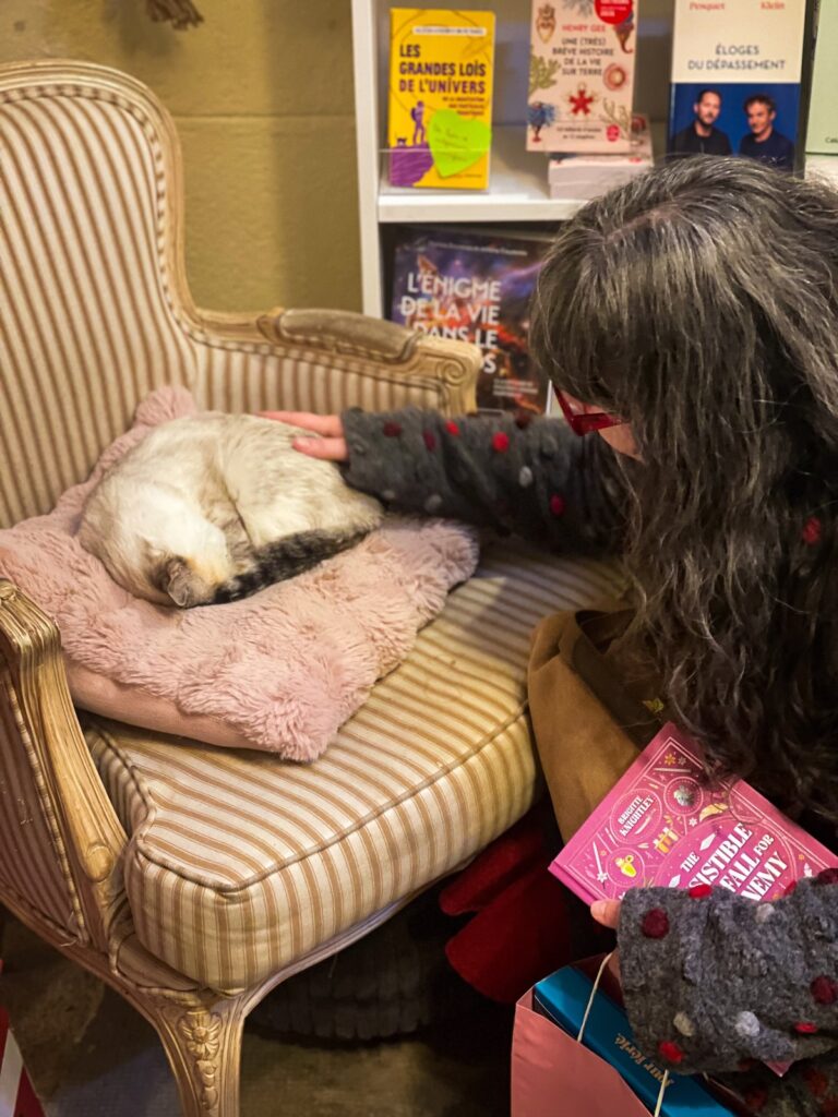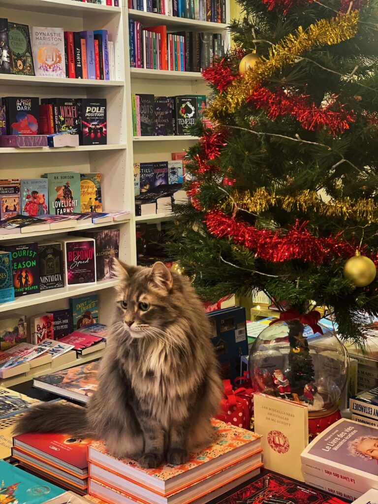 Un peu plus loin, nous poussons la porte de Mon Chat Pitre. Tout au fond de la librairie, ma petite préférée Féfé somnole roulée en boule sur un fauteuil rayé. Elle lève la tête à mon approche et ronronne très fort quand je la caresse. Un jour, je la planquerai dans mon manteau et je m’enfuirai avec elle. Quant au beau Sherlock, pour une fois, il ne trône pas sur une étagère près de la caisse mais déambule majestueusement entre les rayons. Chouchou le piste jusqu’à obtenir une belle photo de lui au pied du sapin. A défaut de Féfé, je ressors avec un roman de fantasy comique dans une jolie édition reliée.