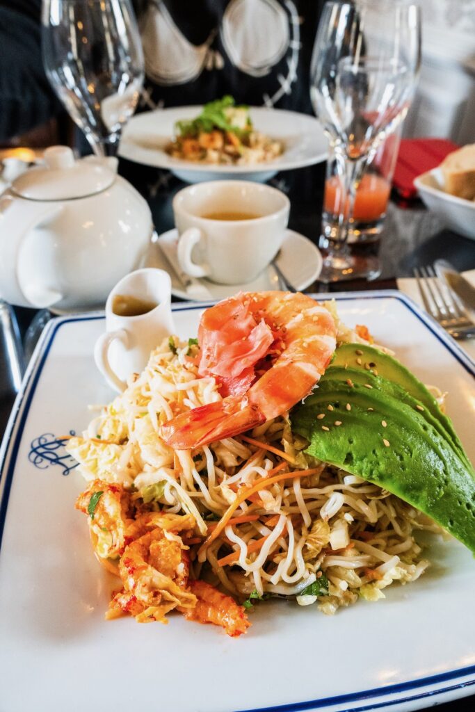 Nous faisons l’ouverture du restaurant situé au rez-de-chaussée. Chouchou opte pour ma salade préférée, la Carmen, tandis que poussée par le froid, je commande plutôt le risotto du jour (espadon, crevettes, olives noires, pignons). Nous nous régalons, mais après ça, je n’ai hélas plus assez faim pour une des délicieuses pâtisseries du chariot de desserts.