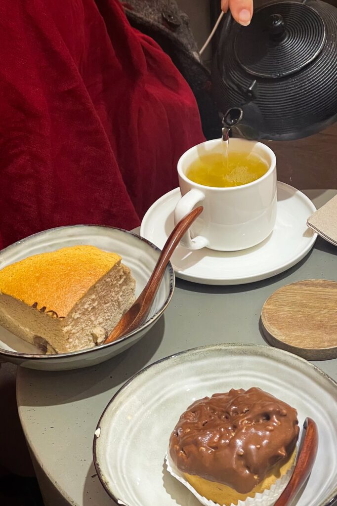 Au lieu de mon habituel cheesecake japonais au yuzu, je décide de tester la version saisonnière aux marrons, dont il ne reste qu’une seule part. Fidèle à lui-même, Chouchou opte plutôt pour une monstruosité au chocolat. A la table voisine de la nôtre, deux jeunes gens font des calculs de rentabilité pour un service de traiteur: « Si on prend 200€ pour 5 plats de 4 portions chacun, ça leur revient 20€ la portion. » Euh, non. Parfois, c’est dur de se mêler de ses affaires.