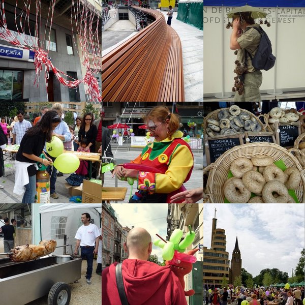 Ce matin sur la place Flagey, il y avait: – de nouveaux bancs très design – un allumé qui se promenait avec un masque à gaz et des grappes de pommes de pin accrochées aux vêtements – des grappes de ballons colorés un peu partout – une gentille dame blonde habillée en clown qui faisait
