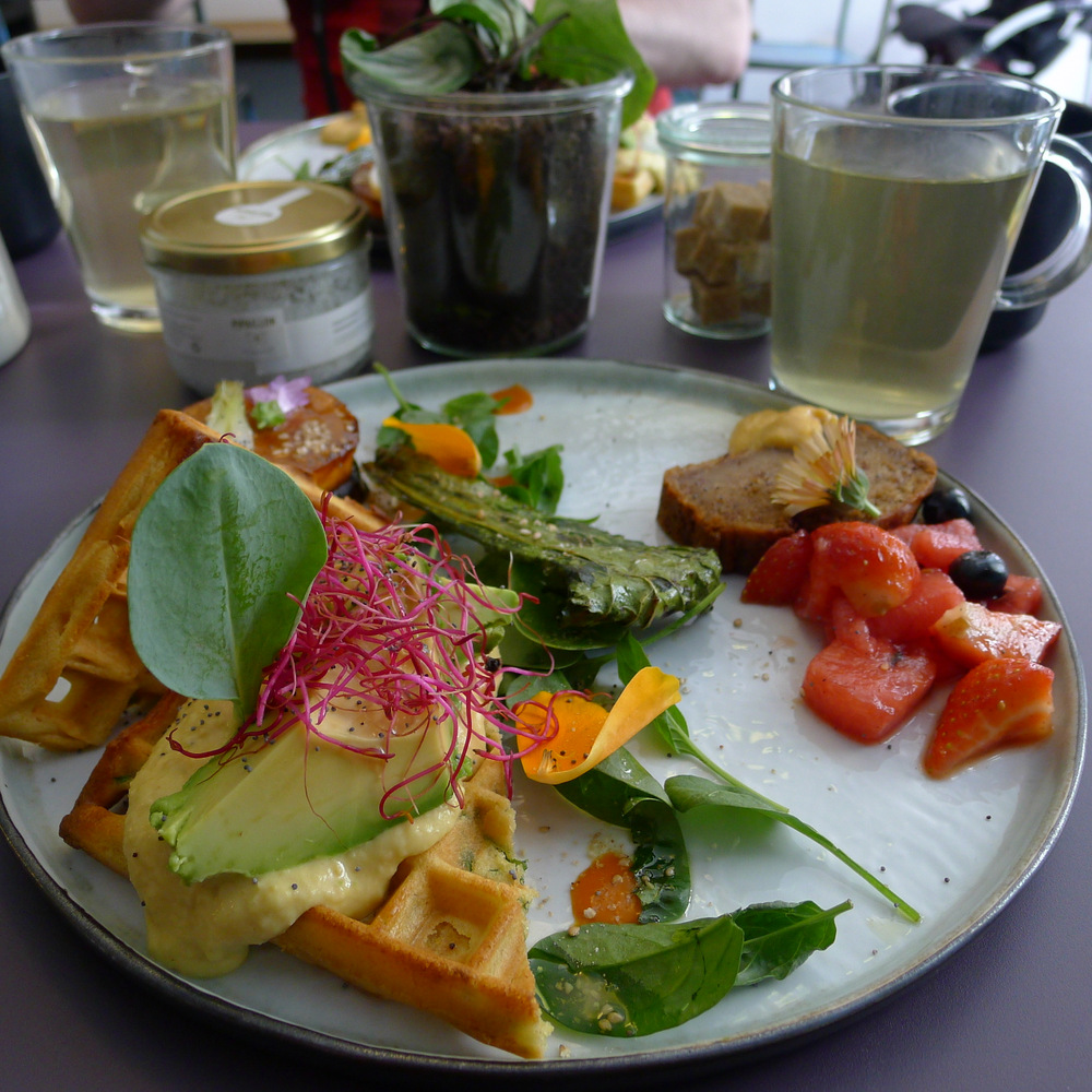 Cette fois, le brunch du dimanche est en réalité un brunch du samedi, car Fourchette à bicyclette est fermé le jour du Seigneur. J’avais déjà déjeuné dans ce sympathique petit resto végétarien situé non loin du parvis Saint-Boniface, et qui propose pas mal de plats vegan et/ou sans gluten. Je me souvenais avoir bien mangé mais être restée un peu sur ma faim à cause de la taille modeste des portions.